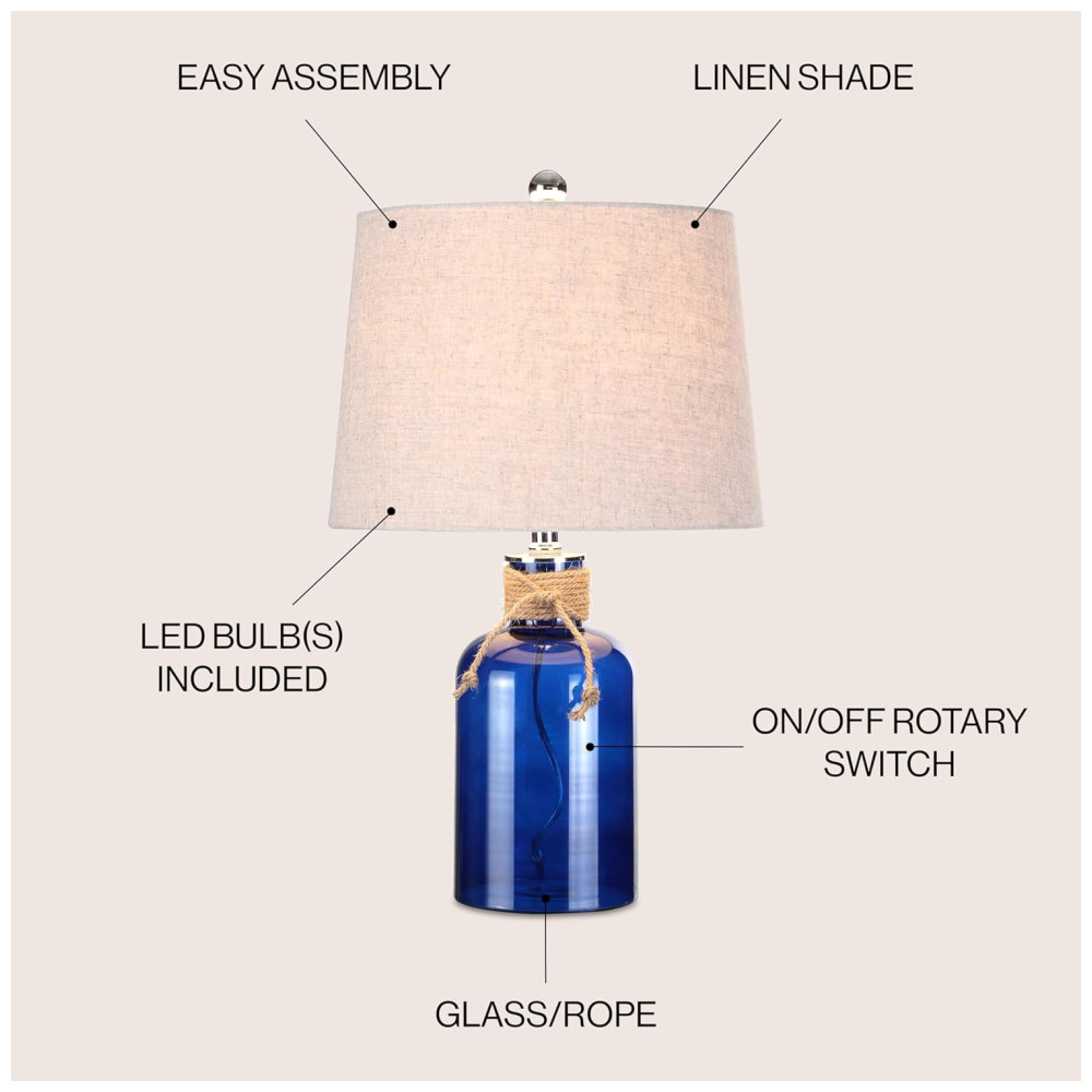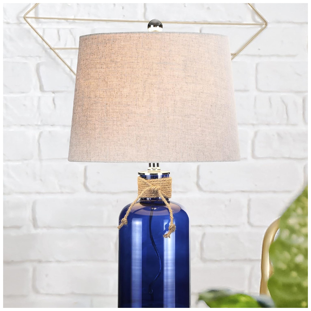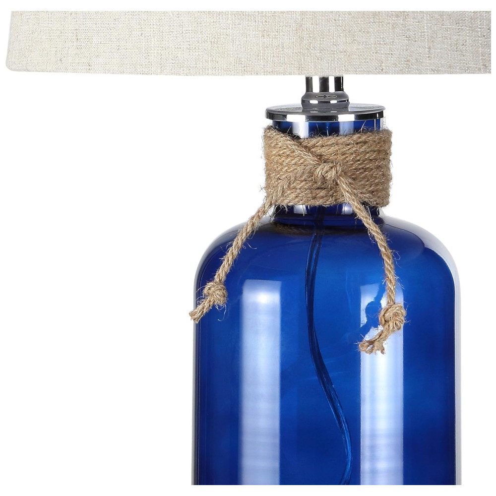 Esta luminária de mesa combina elegância e inspiração costeira com sua base de garrafa de vidro em um tom azul, que remete ao vidro marinho. Detalhada com um toque de corda náutica e acabamento cromado, a base de vidro refrata a luz, criando um brilho quente e acolhedor no ambiente. O abajur, feito de 100% algodão na cor cinza natural, complementa perfeitamente o design, adicionando um toque sutil de inspiração oceânica ao seu espaço.
