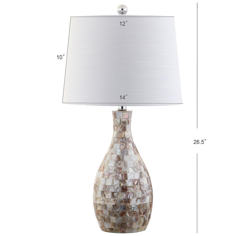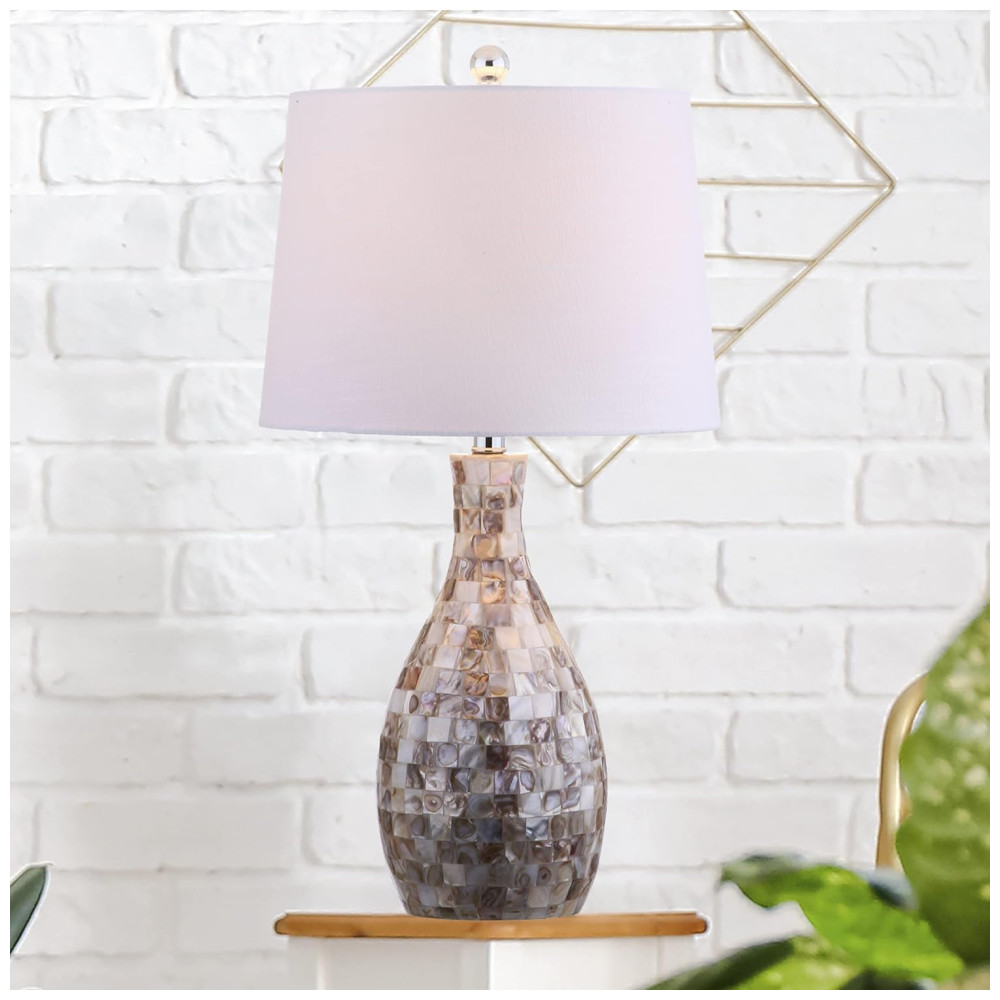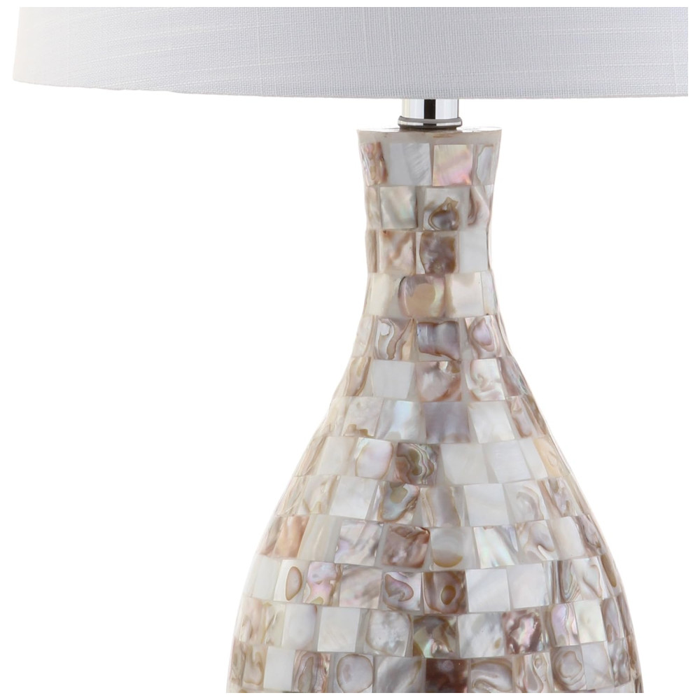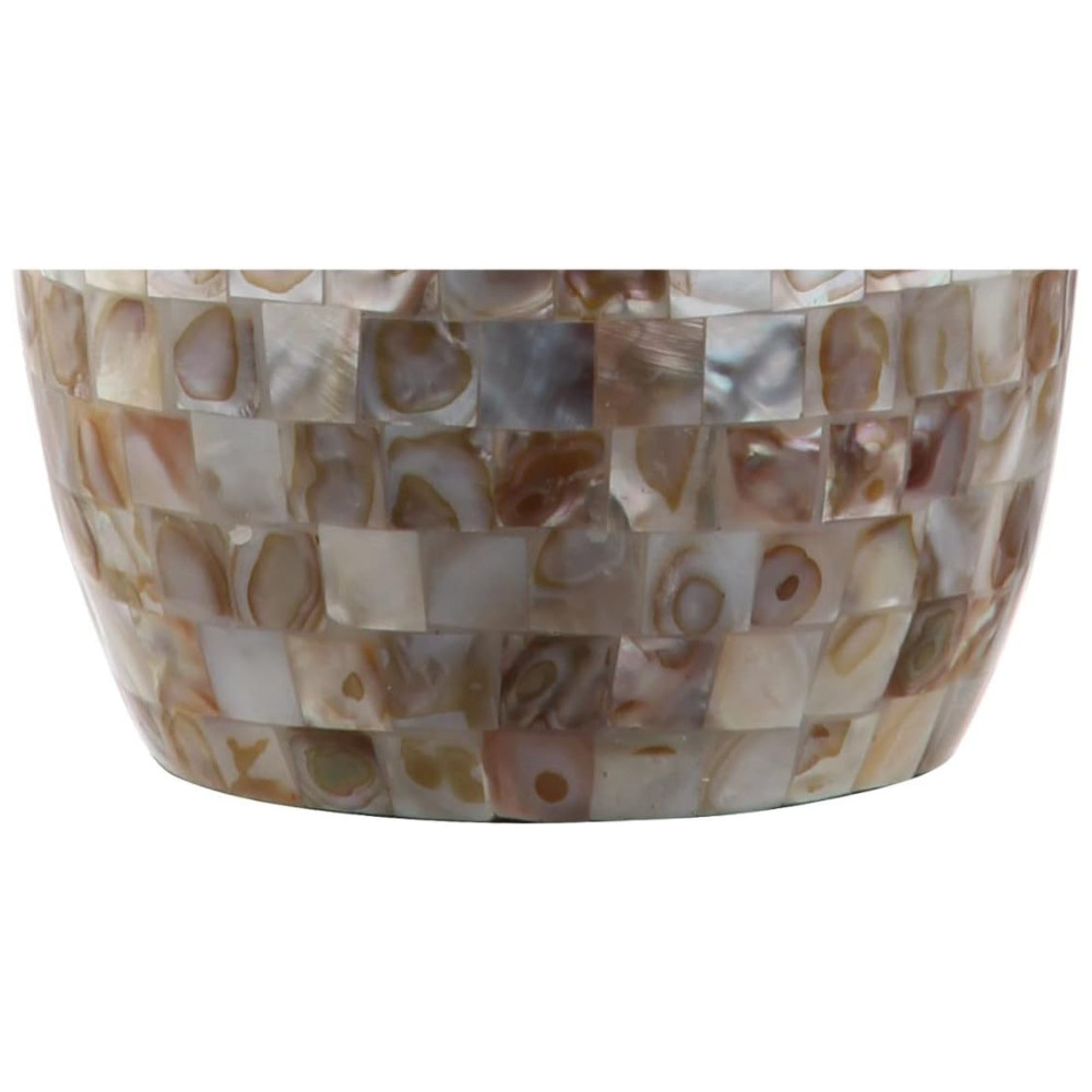 Este candeeiro de mesa combina sofisticação e elegância com seu design distinto. A base curva é adornada com um mosaico de azulejos de concha capiz, destacando detalhes cromados que acentuam sua beleza. O tom neutro do linho branco da cúpula equilibra o visual, enquanto o cordão envolto em seda adiciona um toque de estilo até o plugue. Quando aceso, as conchas refletem o brilho quente da lâmpada, revelando nuances que vão do marfim ao bronze.