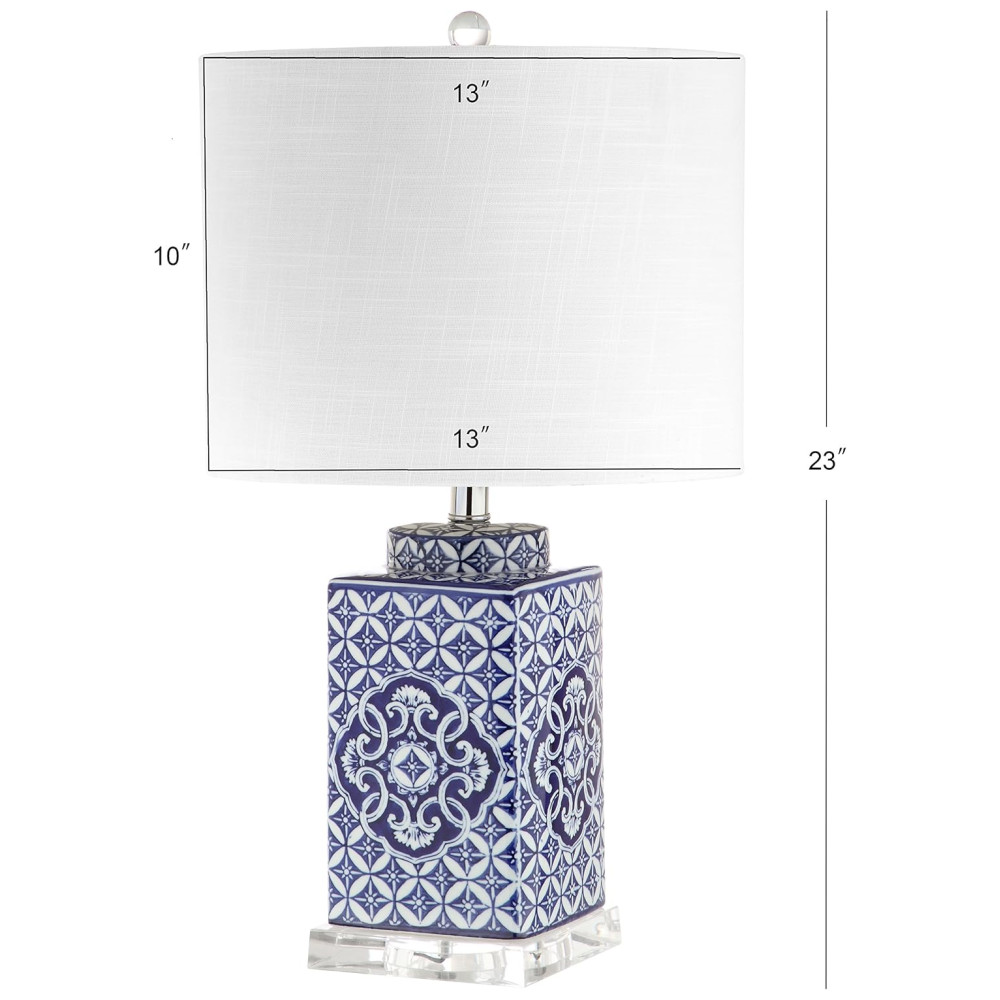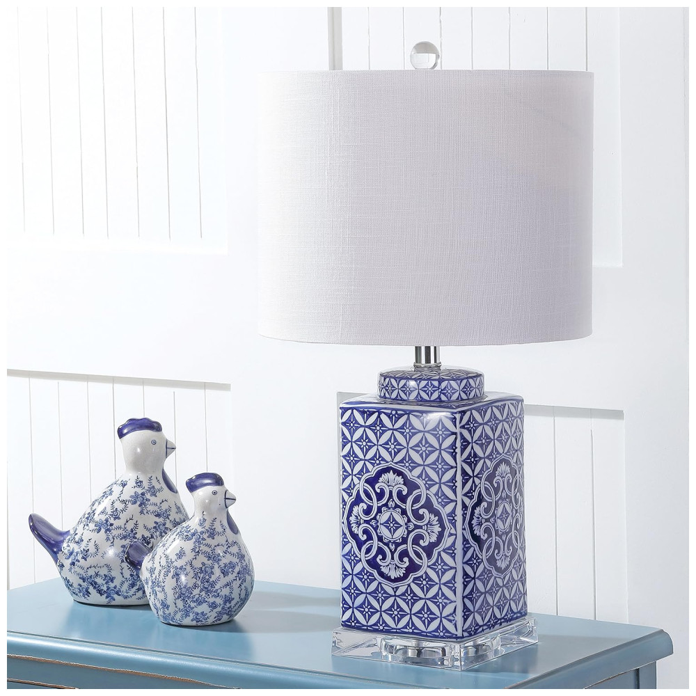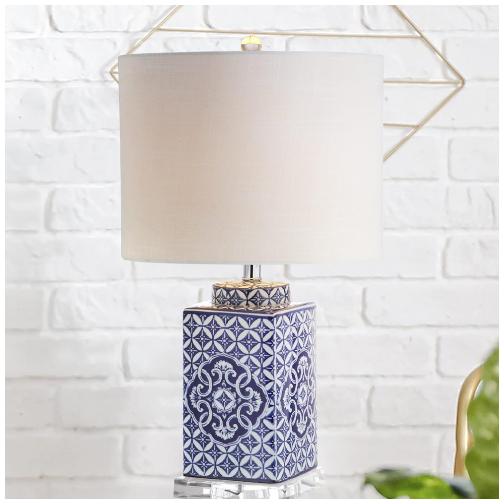 Este candeeiro de mesa azul e branco traz um toque moderno com sua base de acrílico transparente. O abajur em linho, com bordas arredondadas, complementa o design elegante, que é finalizado com um detalhe em Lucite e um cordão revestido em seda. As lâmpadas de mesa JONATHAN Y são projetadas para iluminar sua casa com sofisticação, sendo a escolha perfeita para qualquer ambiente.