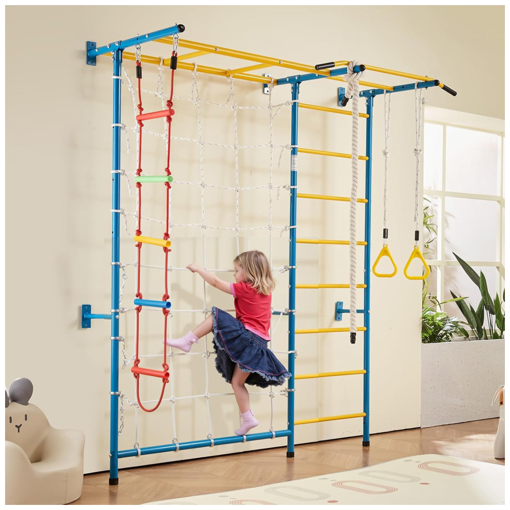 A Academia de Escalada Multifuncional da VEVOR para crianças combina uma barra de pullup, argolas de ginástica, escada de corda e outras atividades de brincadeira para ajudar as crianças a se exercitarem, melhorarem a coordenação e se divertirem. Este conjunto de escalada indoor foi projetado para fortalecer as crianças fisicamente, melhorar a coordenação motora e incentivá-las a enfrentar desafios. Superar medos e tentar novas escaladas promove coragem, confiança e crescimento pessoal. Feito de aço carbono de alta resistência, este conjunto de academia indoor para crianças é resistente a arranhões e desgaste, garantindo estabilidade aprimorada e longa vida útil. A superfície resistente à ferrugem é fácil de limpar com um pano úmido. Com capacidade de peso máxima de 100kg, até mesmo adultos podem desfrutar da academia de escalada indoor, tornando-a perfeita para brincadeiras em família e promovendo união e atividade física divertida juntos. Fácil de instalar, nossa academia infantil é simples e rápida de montar com um guia de instalação detalhado. Pode ser montado em quartos de crianças, centros de aprendizagem precoce ou pré-escolas, tornando-o versátil para uma variedade de espaços.