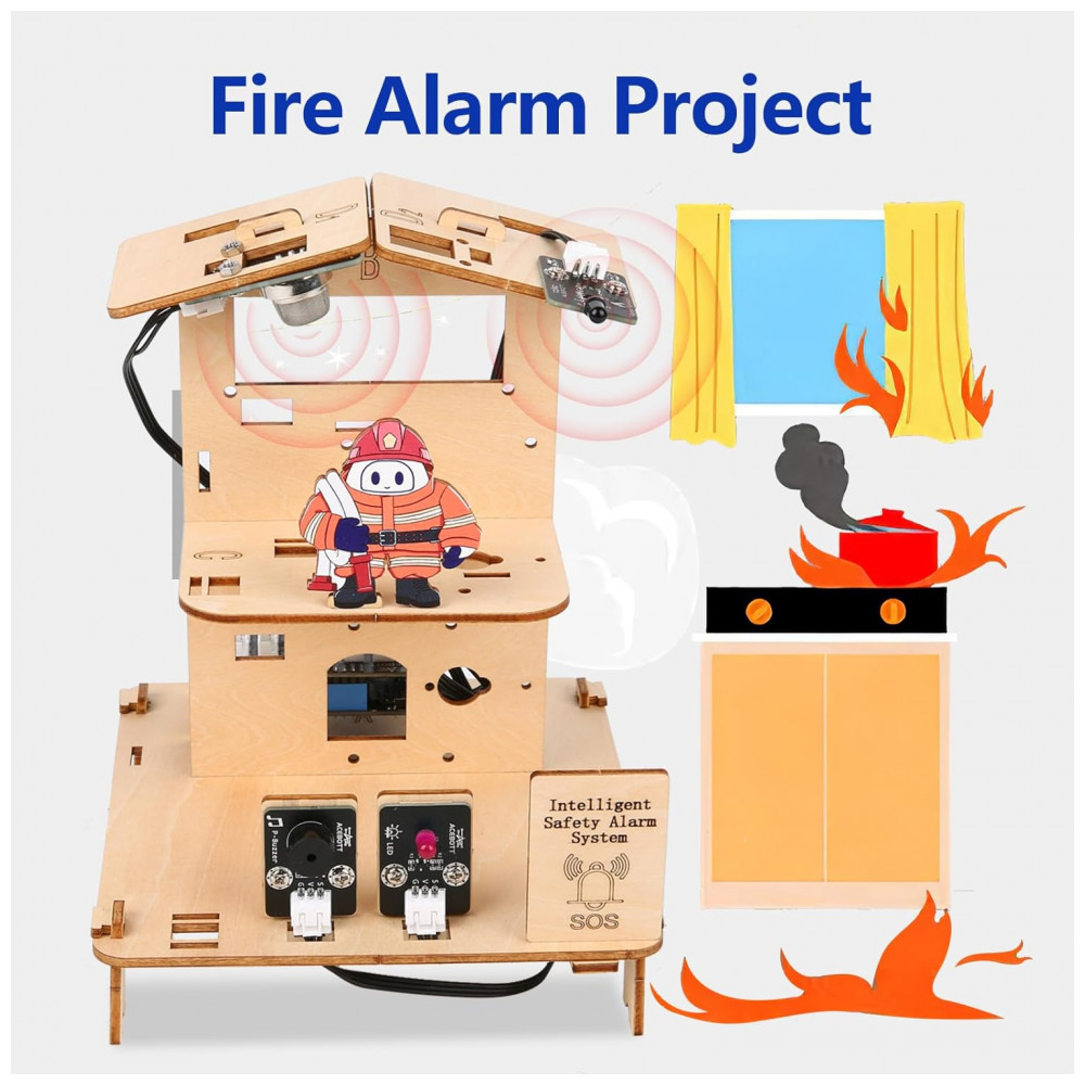 O kit ACEBOTT 5-in-1 ESP32 Smart Home and School é um conjunto educativo de automação residencial e escolar que permite montar cinco projetos diferentes com um único controlador ESP32 compatível com Arduino. Com ele, estudantes podem construir cenários como alimentador automático de pets, varal automático, controle de acesso inteligente, sistema de alarme de segurança e sistema de irrigação automática, explorando conceitos de eletrônica, sensores e atuadores em aplicações reais. As estruturas são formadas por peças em ABS e madeira, recortadas em templates 3D sem necessidade de solda, com instruções detalhadas em alta definição que conduzem passo a passo a montagem e a programação.