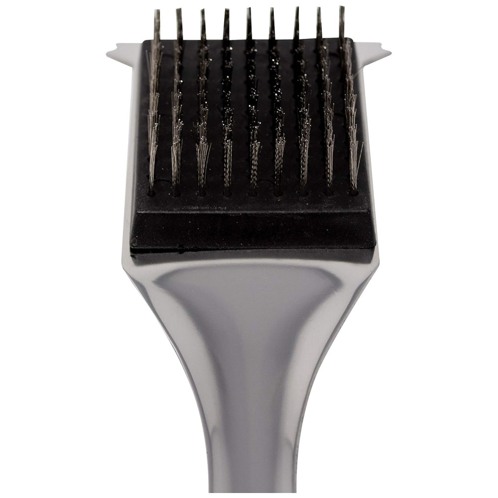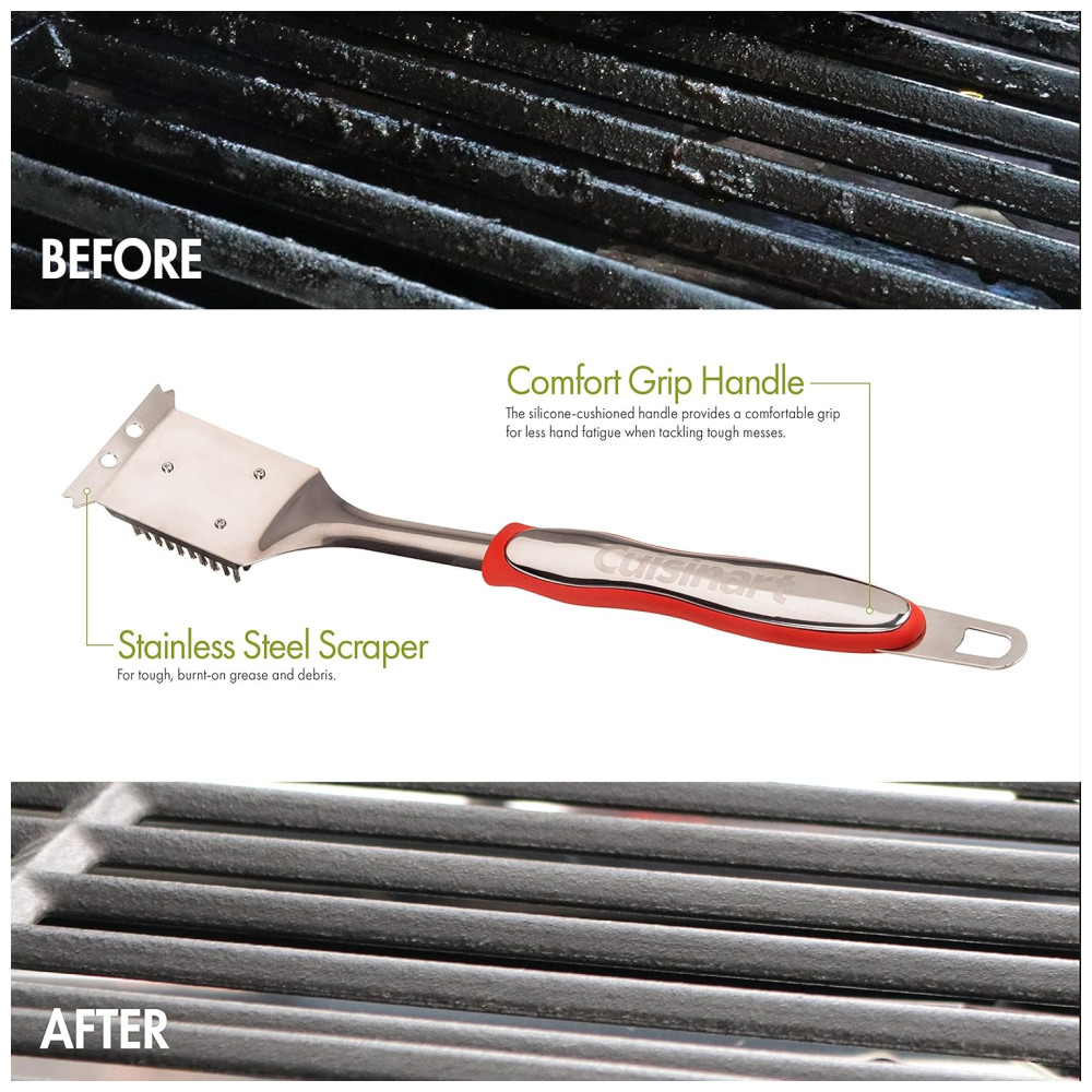 A escova permite alcançar e limpar com segurança todas as áreas da grelha. A escova pode ser utilizada sozinha ou como parte da colecção correspondente, Cuisinart Grill Set CGS 134 PUNHO COMFORT GRIP A pega ergonómica almofadada em silicone foi construída para proporcionar uma melhor aderência com menos fadiga manual O cabo foi concebido num ângulo para alcançar a grelha e limpar completamente a grelha PROJETO DE AÇO INOXIDÁVEL A pega da escova e a cabeça é feita de um aço inoxidável durável que não enferruja nem se deteriora para dar uma limpeza impecável após o uso RASPADOR DE AÇO INOXIDÁVEL A escova possui um raspador de aço inoxidável para ajudar a remover detritos difíceis das grades. TODAS AS FACETAS DO GRATE A escova é projetada para alcançar todas as facetas da grade apenas mudando o ângulo, e a extremidade possui um raspador plano com lados côncavos que se encaixam em pequenos lugares.