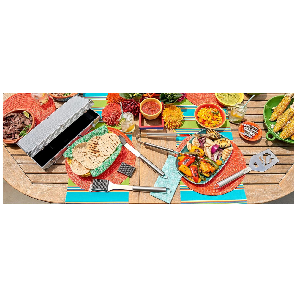 Conjunto de grelhador inclui espátula do chef, pinças para grelhar, escova de silicone, 4 pares de suportes de milho, escova de limpeza e cabeça de escova extra Também inclui estojo de alumínio perfeito para a grelha em movimento Construção de ferramentas de aço inoxidável durável Alças alongadas anéis de alça convenientes para pendurar medidas de 7,1 por 3,2 por 17,3 polegadas Espátula tem abridor de garrafas embutido.