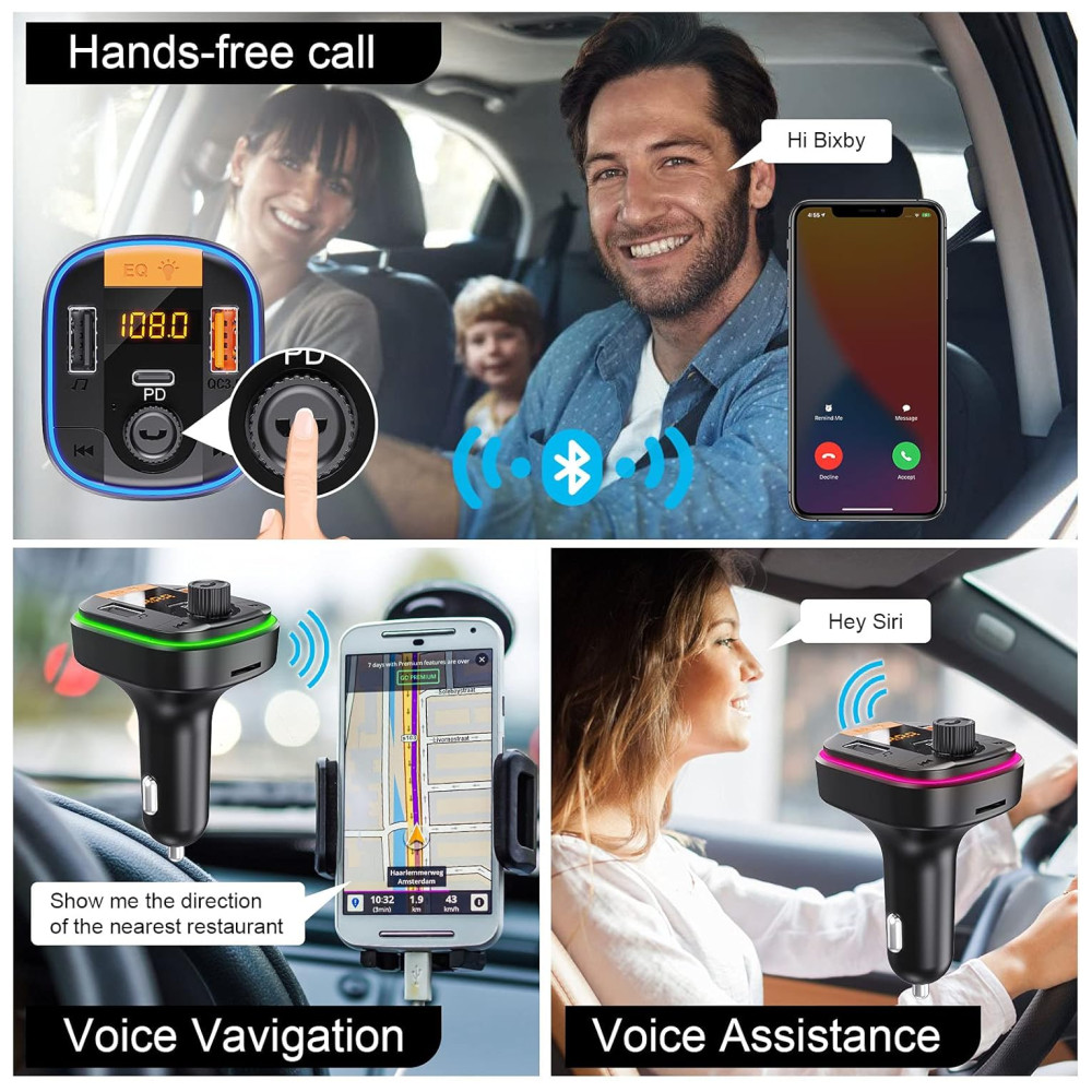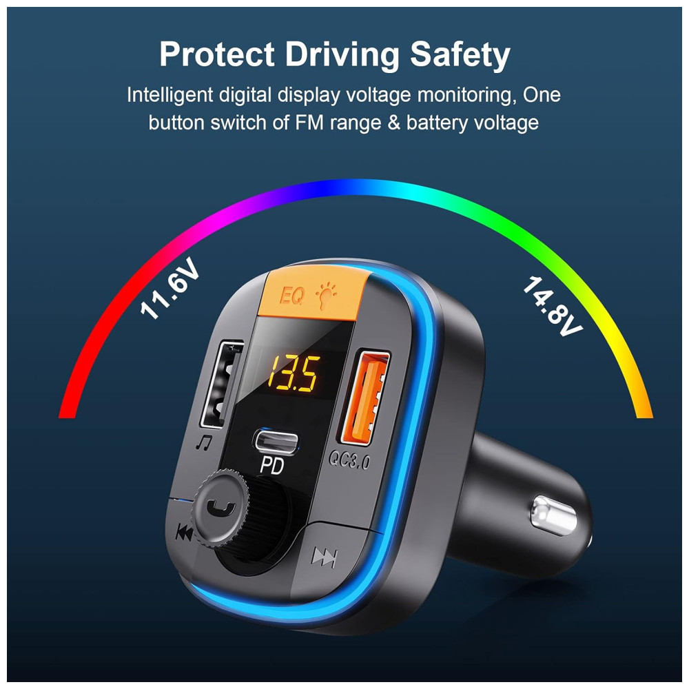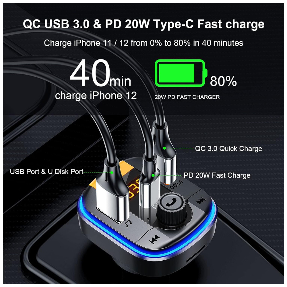 O transmissor FM Bluetooth BAISHUN PD20W QC3.0 traz conectividade Bluetooth 5.0 ao seu veículo, operando em carros 12V a 24V. Permite transmissão de músicas via Bluetooth, cartão microSD (TF) ou pen drive USB (até 32GB, nos formatos MP3/FLAC/WMA/APE), além de função viva-voz com microfone antirruído integrado para chamadas mais claras e seguras. Possui três portas USB: uma USB-C PD20W, uma USB 3.0 QC3.0 e uma USB 5V/1A, possibilitando recarga rápida de smartphones, tablets e outros dispositivos (carregamento até 4x mais rápido, 0 a 80% em 40 min). O display LCD exibe frequência de rádio FM, status das portas de carga e monitoramento da tensão da bateria automotiva. É compatível com comandos de voz Siri e Google Assistant. Conta com iluminação LED em 7 cores para efeito visual, ajuste de canais FM via botão dedicado e proteção contra curto-circuito, sobretensão e sobrecorrente. Fácil instalação/remoção sem necessidade de ferramentas.