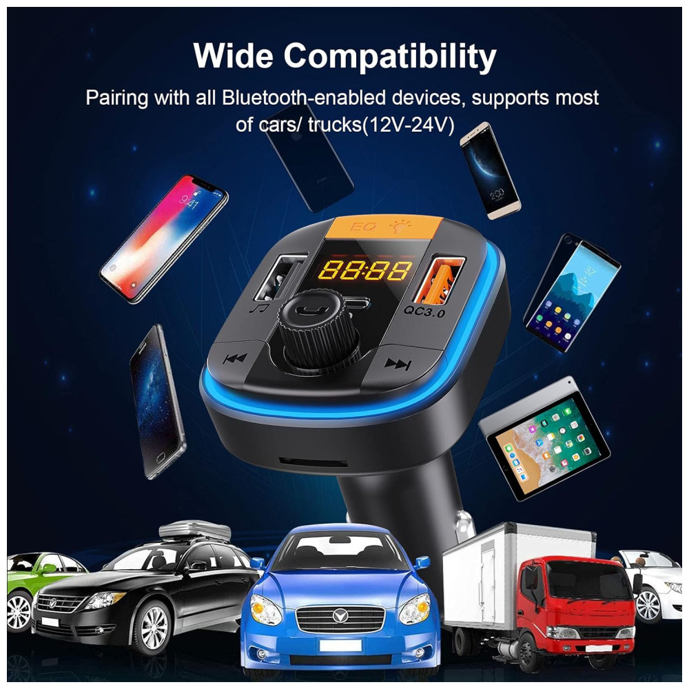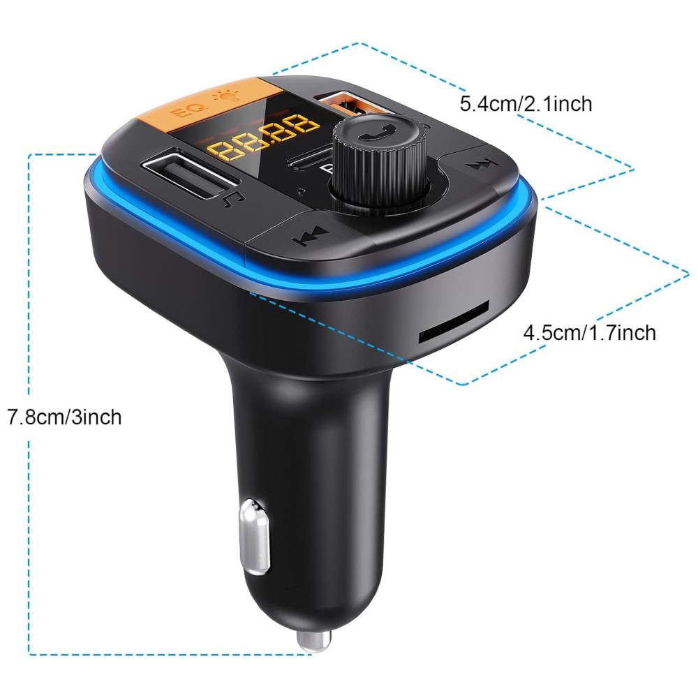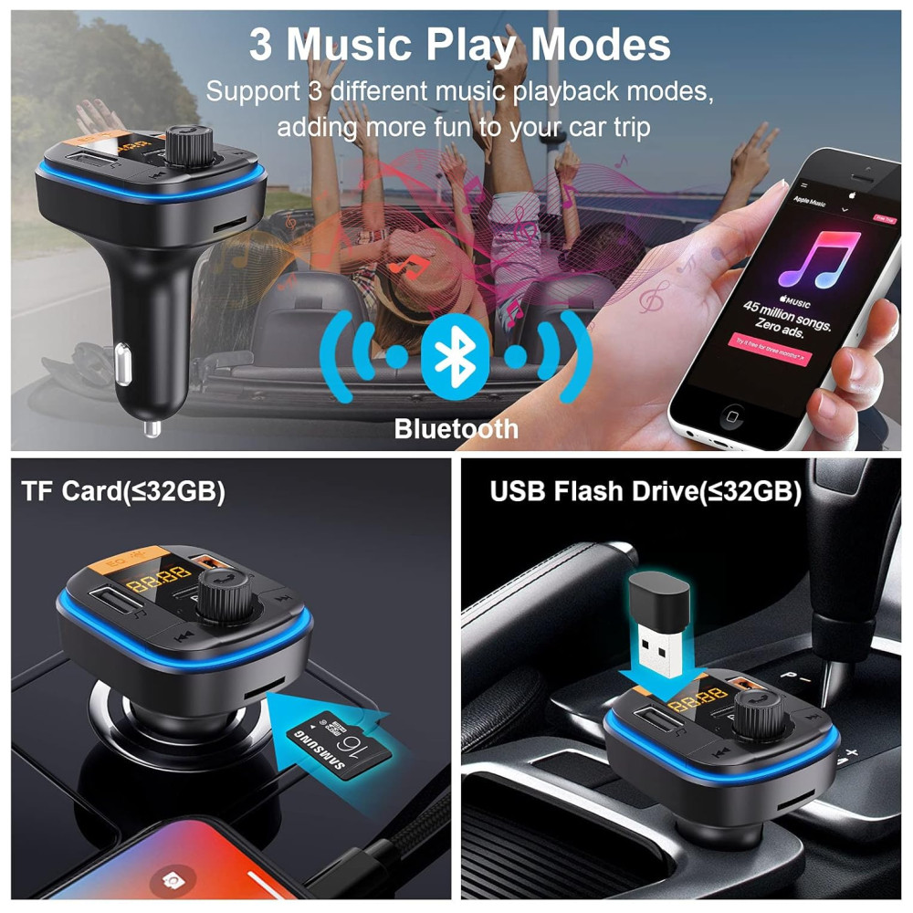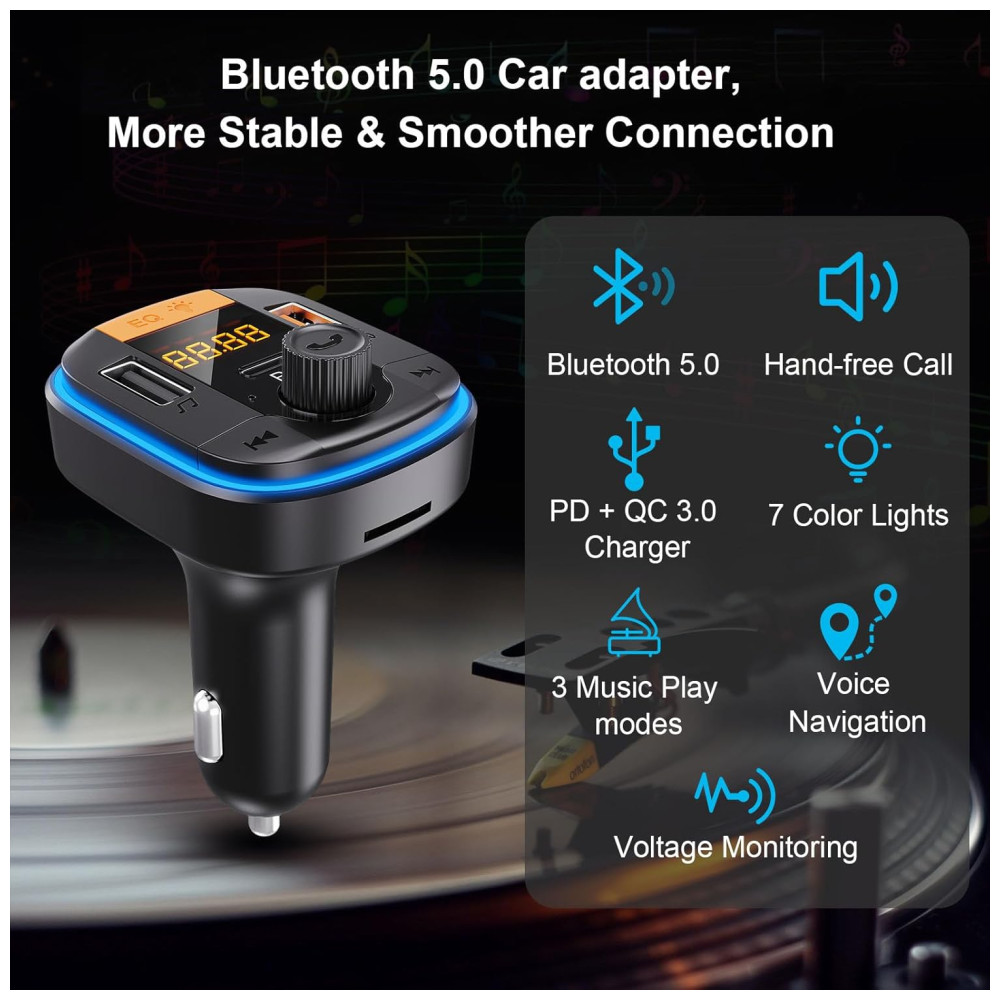 O transmissor FM Bluetooth BAISHUN PD20W QC3.0 traz conectividade Bluetooth 5.0 ao seu veículo, operando em carros 12V a 24V. Permite transmissão de músicas via Bluetooth, cartão microSD (TF) ou pen drive USB (até 32GB, nos formatos MP3/FLAC/WMA/APE), além de função viva-voz com microfone antirruído integrado para chamadas mais claras e seguras. Possui três portas USB: uma USB-C PD20W, uma USB 3.0 QC3.0 e uma USB 5V/1A, possibilitando recarga rápida de smartphones, tablets e outros dispositivos (carregamento até 4x mais rápido, 0 a 80% em 40 min). O display LCD exibe frequência de rádio FM, status das portas de carga e monitoramento da tensão da bateria automotiva. É compatível com comandos de voz Siri e Google Assistant. Conta com iluminação LED em 7 cores para efeito visual, ajuste de canais FM via botão dedicado e proteção contra curto-circuito, sobretensão e sobrecorrente. Fácil instalação/remoção sem necessidade de ferramentas.