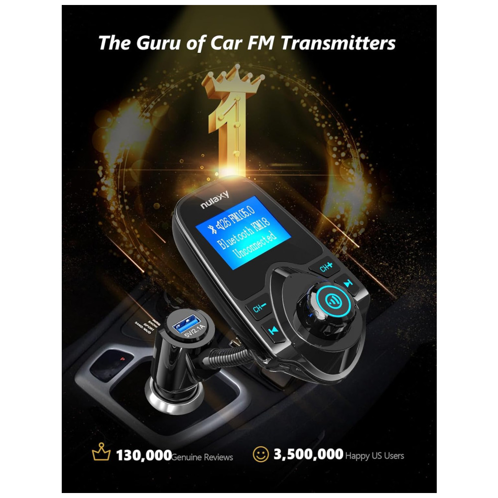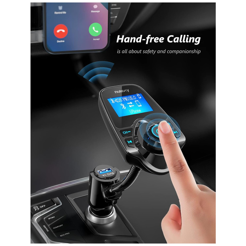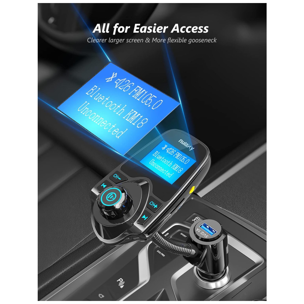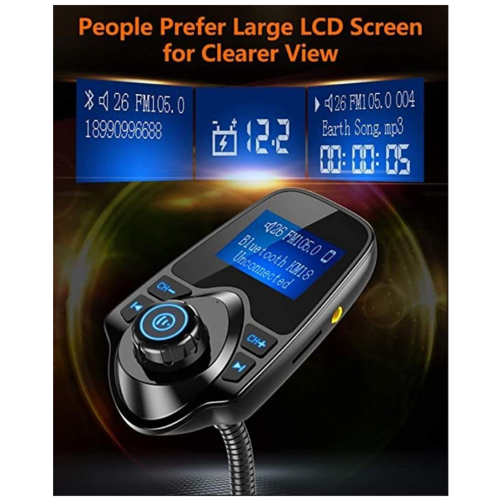 Display LCD de 1,44 polegadas O transmissor Nulaxy KM18 Bluetooth FM possui uma tela de 1,44 polegadas para melhor exibição de informações como chamadas telefônicas, canais FM, música, voltagem da bateria do carro, etc. O tamanho de tela ideal para ajudá lo a dirigir com segurança sem perturbações.