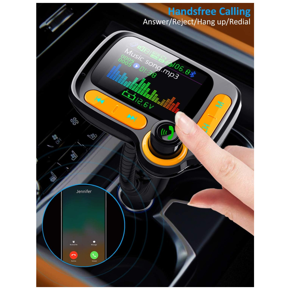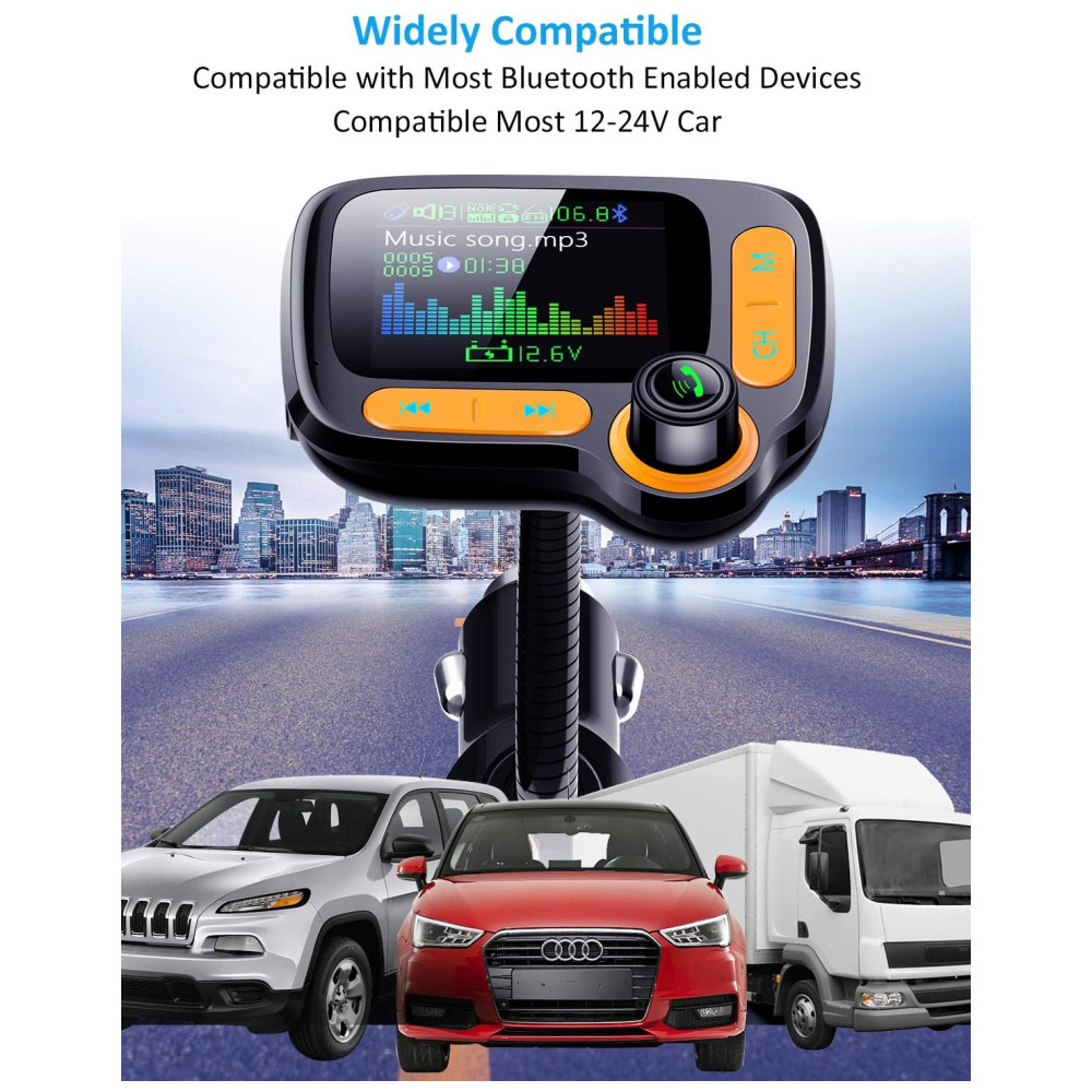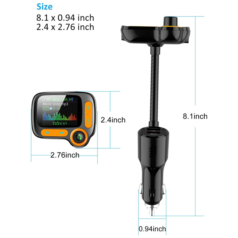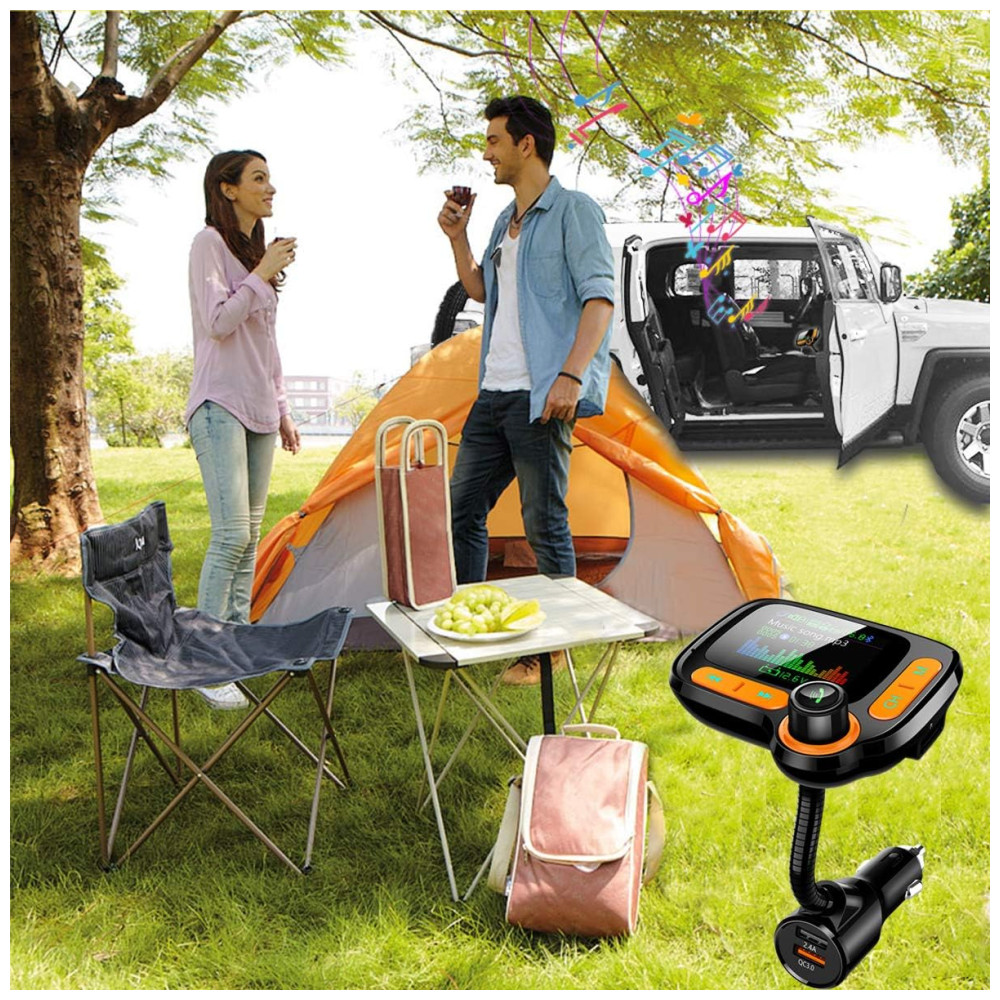 Tela colorida de e pescoço de ganso flexível e botão laranja A tela TFT é grande e clara o suficiente para você ler facilmente a tensão, o volume, o nome da música nos modos TF , U disk, a frequência FM, o volume etc. durante o dia e O transmissor FM Bluetooth oferece a versatilidade de alterar o ângulo da tela com um pescoço de ganso robusto de 360 graus que se manterá firme na orientação que você definir.