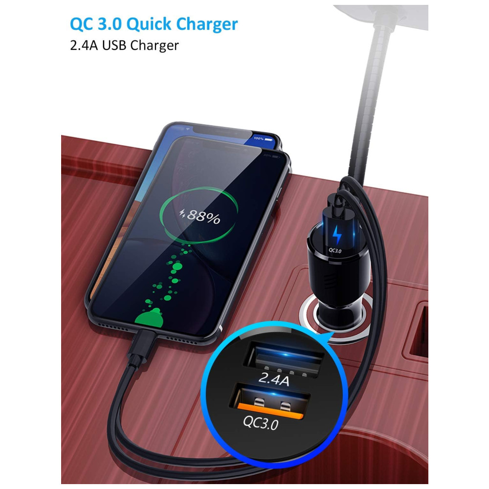3 portas USB e carregador QC3.0 Entrada 12 24 V Saída 3 portas USB 1 porta de carregamento USB suporta saída 5V , 2,4 A que pode identificar o Android ou outros dispositivos de forma inteligente. 1 Dispositivos habilitados para USB QC3.0, até 4X mais rápido do que carregadores padrão, capazes de carregar dispositivos compatíveis até 80 em apenas 35 minutos. 1 porta USB apenas para leitura de U disk. O transmissor FM pode carregar 2 dispositivos simultaneamente e ouvir música , chamadas em viva voz.