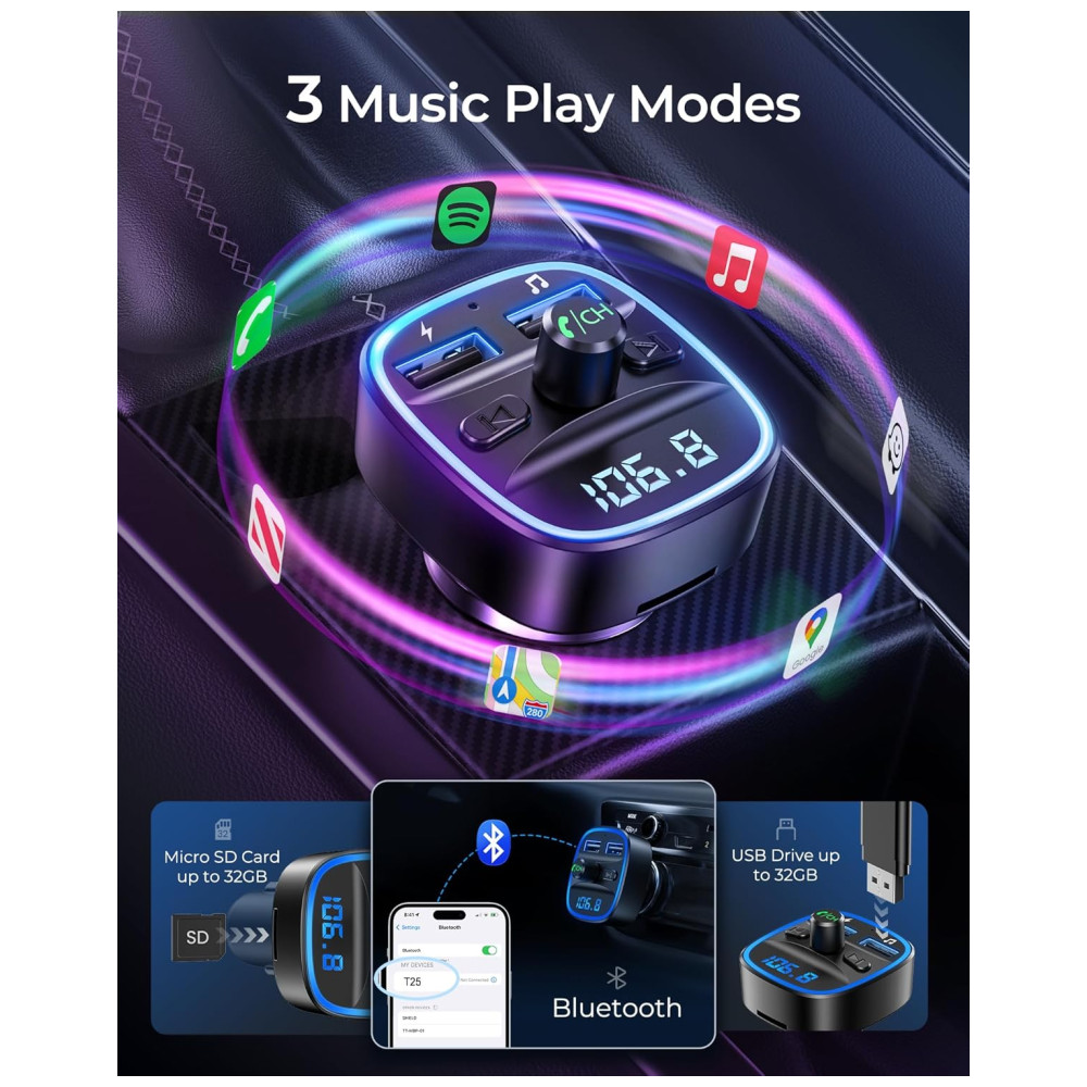 Adaptador Transmissor Veicular Bluetooth Veicular USB LED LENCENT T25 Preto