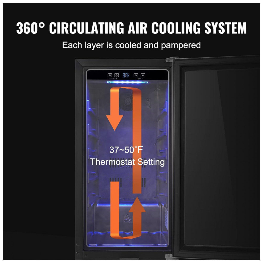 Frost free Air Cooling O resfriador de bebidas embutido simula a temperatura e a umidade da adega , mantendo uma temperatura constante durante todo o ano. Com um sistema de resfriamento de ar circulante, ele pode cuidar de cada garrafa de sua cerveja, bebida, vinho e cuidar do sabor suave.