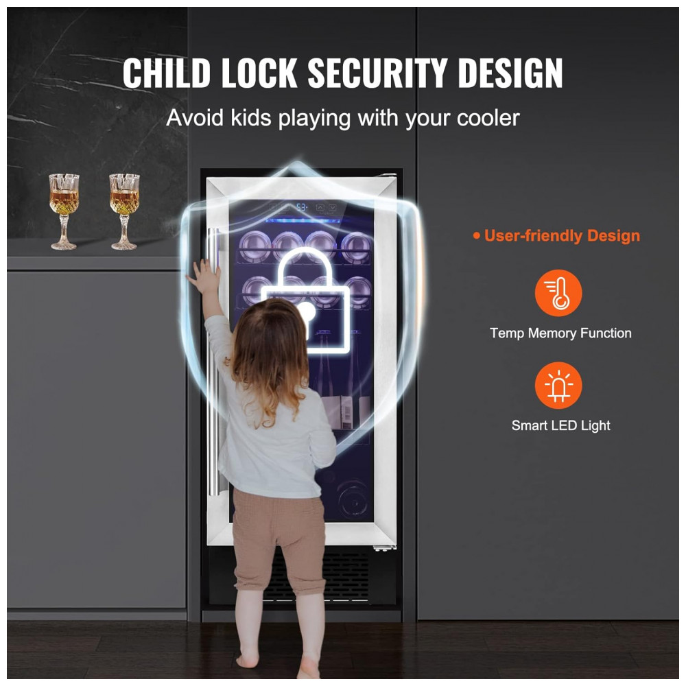Segurança e Versátil O refrigerador de bebidas está equipado com função de bloqueio para crianças, protegendo a segurança de sua família e também protegendo seu precioso vinho. Não só pode zenar vinhos preciosos, como vinho tinto, mas também bebidas, frutas e outros alimentos que precisam ser refrigerados.
