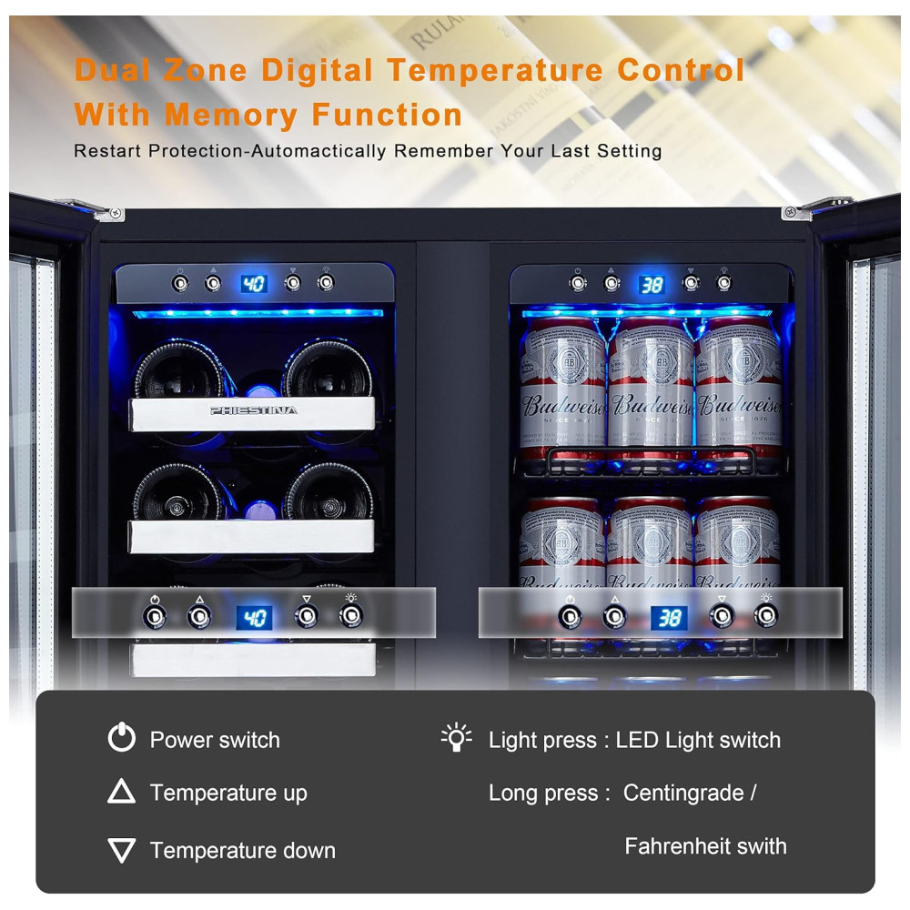 ZONAS DUPLAS DE TEMPERATURA com controles digitais mantêm a geladeira de vinho entre 4C e 19C, enquanto a geladeira de cerveja do lado direito fica entre 3C e 10C para máxima refrescância e satisfação.