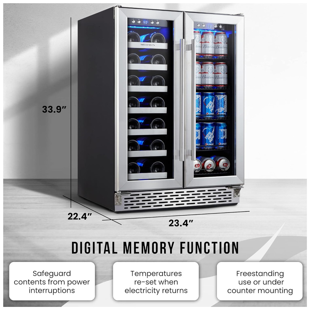 A GELADEIRA PARA BEBIDAS SIDE BY SIDE acomoda 20 garrafas de vinho e 78 latas em prateleiras removíveis. As portas francesas com frente de vidro e a iluminação LED azul facilitam a visualização das seleções de bebidas e quando é necessário reabastecer.