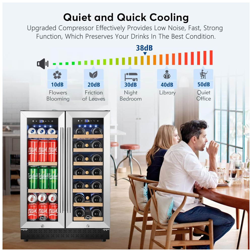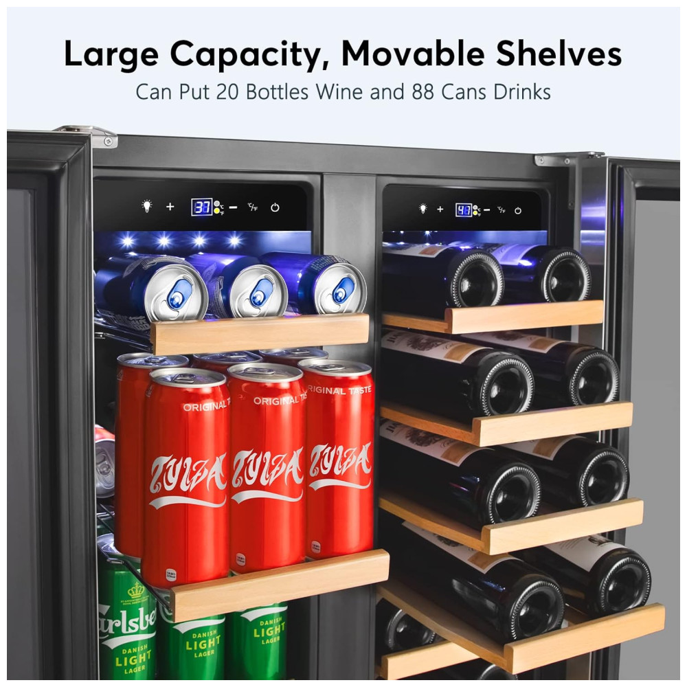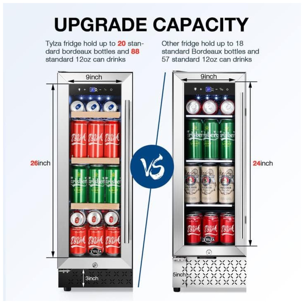 Grande capacidade para bebidas e vinhos O refrigerador de vinho TYLZA pode zenar até 20 garrafas Bordeaux padrão e 88 latas de bebidas padrão de 12 oz, 330 ml. Esta unidade é perfeita para zenar vinho, refrigerante, cerveja e água juntos. O refrigerador de vinho possui prateleiras removíveis que facilitam a escolha e a colocação dos itens.