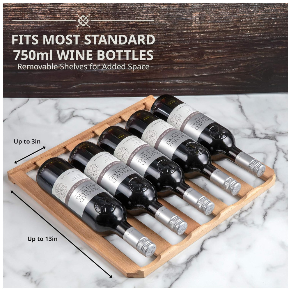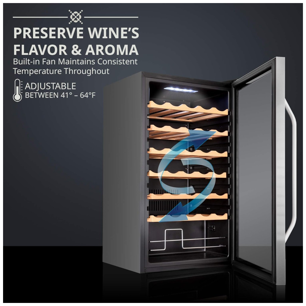 PRESERVE O SABOR E O AROMA COMPLETOS DO VINHO Defina a temperatura e deixe o refrigerador de vinho fazer o resto. Com um ventilador embutido que mantém uma temperatura consistente em todo o espaço, este refrigerador garante um ambiente ideal para zenamento de vinho a longo prazo.