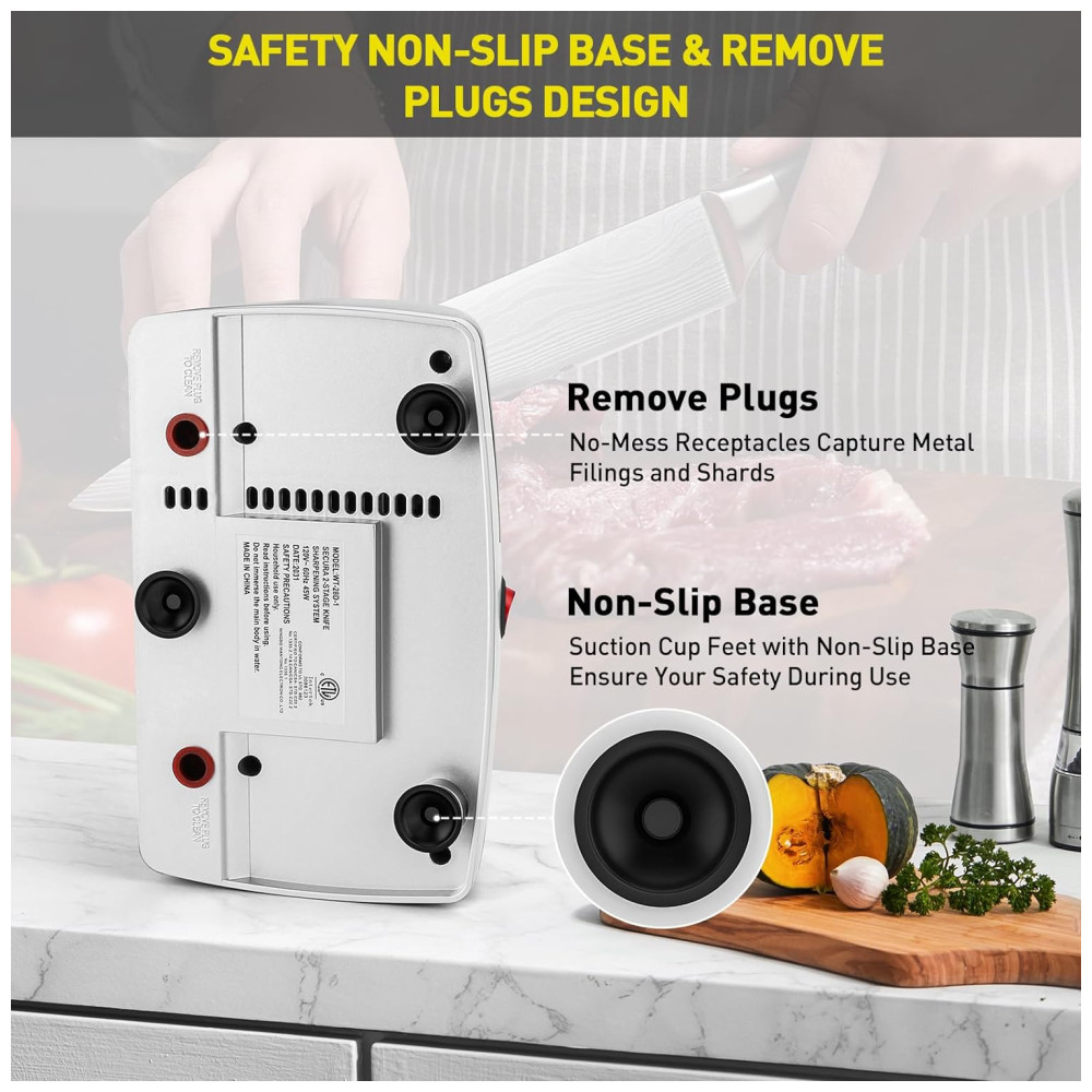 Forte e Segurança O Afiador de Facas de Cozinha Secura Com pés de ventosa antideslizantes para serviços pesados, mantenha o afiador firmemente no lugar durante o uso para evitar acidentes.