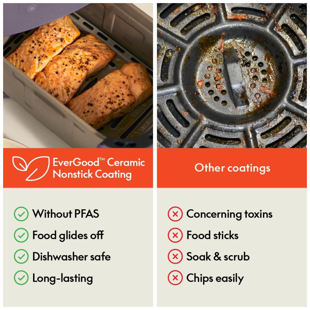 Revestimento Antiaderente EverGood: O revestimento cerâmico exclusivo garante fácil limpeza e é totalmente livre de PFAS, PFOA, PTFE, chumbo e cádmio, proporcionando uma experiência de cozimento mais saudável e prática.