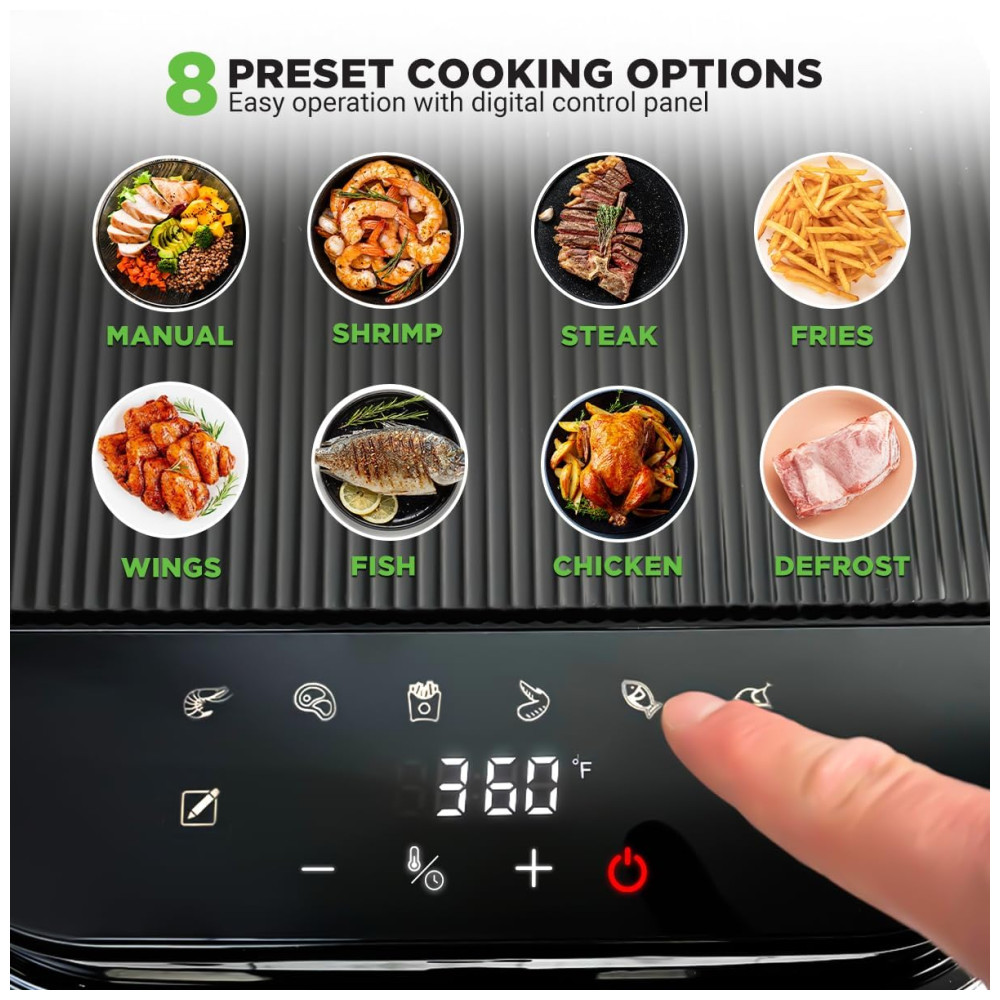 Equipada com uma tela sensível ao toque LED de alta definição, esta air fryer oferece uma visualização clara e personalizada do cozimento, além de uma janela transparente para monitoramento constante. A tecnologia de circulação de ar quente de 360 graus garante um cozimento rápido e uniforme com pouco ou nenhum óleo.