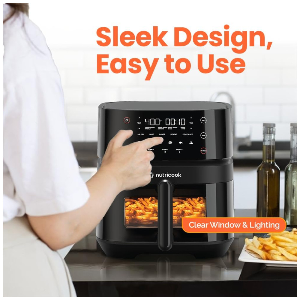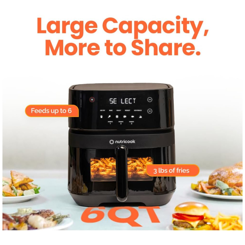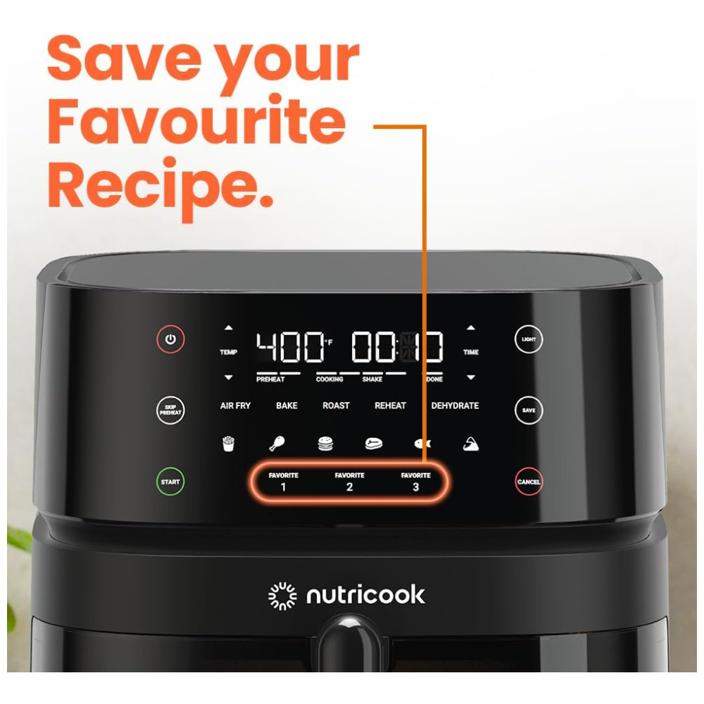 Você ainda pode personalizar e salvar as configurações de 3 das suas receitas favoritas para acessá-las rapidamente com um toque dos botões de favoritos. Com capacidade para até 1,36 kg de batatas fritas ou um frango inteiro de até 1,18 kg, esta fritadeira é ideal para alimentar uma família de até 6 pessoas.