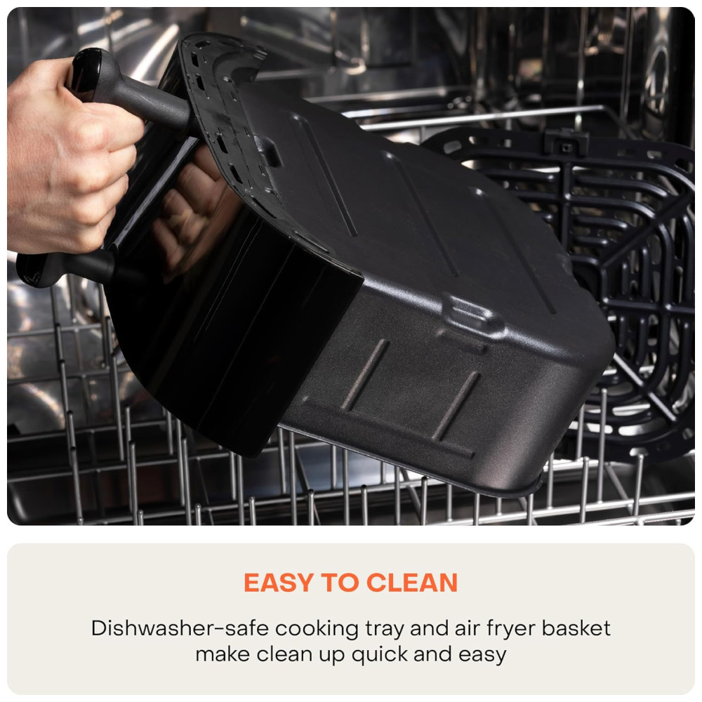 Além disso, a cesta quadrada e a bandeja de cozimento são removíveis e podem ser lavadas na máquina de lavar louça, o que torna a limpeza muito mais prática e conveniente.
