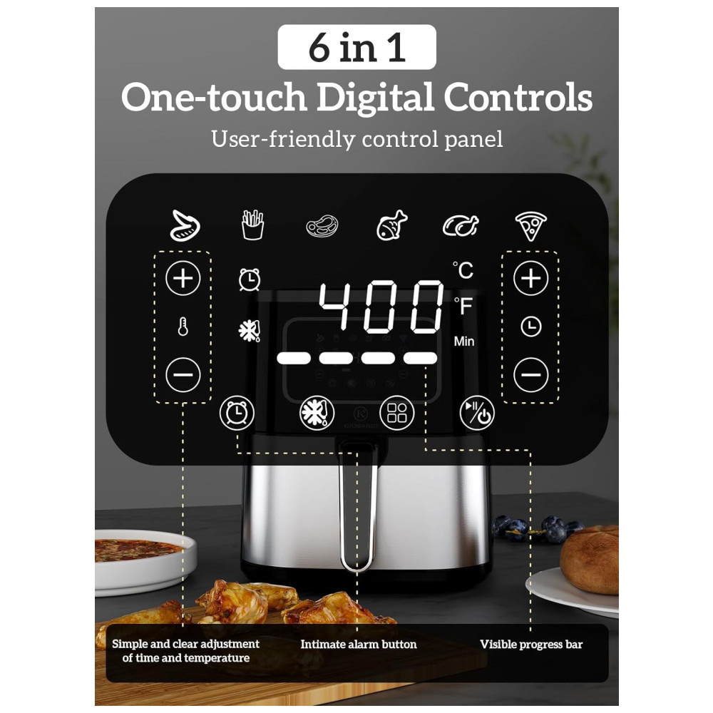 Air Fryer 6 em 1 5.2L com Painel Digital Cesta Antiaderente Desligamento Automático e Lavável na Máquina de Lavar Louça 110V 1350W Kitchen Elite Preta