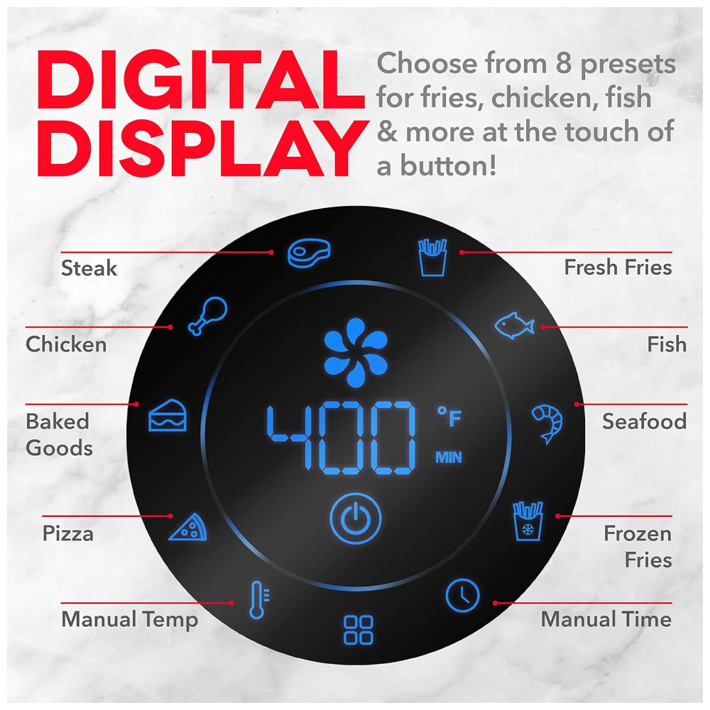 Display Digital + 8 Predefinições: Com uma capacidade de 6 litros, basta carregar a cesta da fritadeira, escolher uma das 8 predefinições (ou ajustar manualmente), e pronto! Seus alimentos saem crocantes todas as vezes, e em menos tempo do que levaria para pré-aquecer o forno, tornando o processo mais eficiente energeticamente.