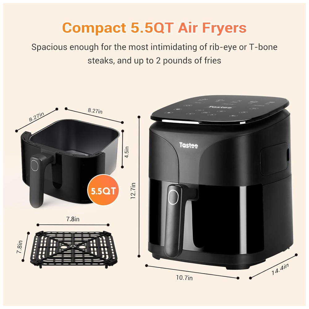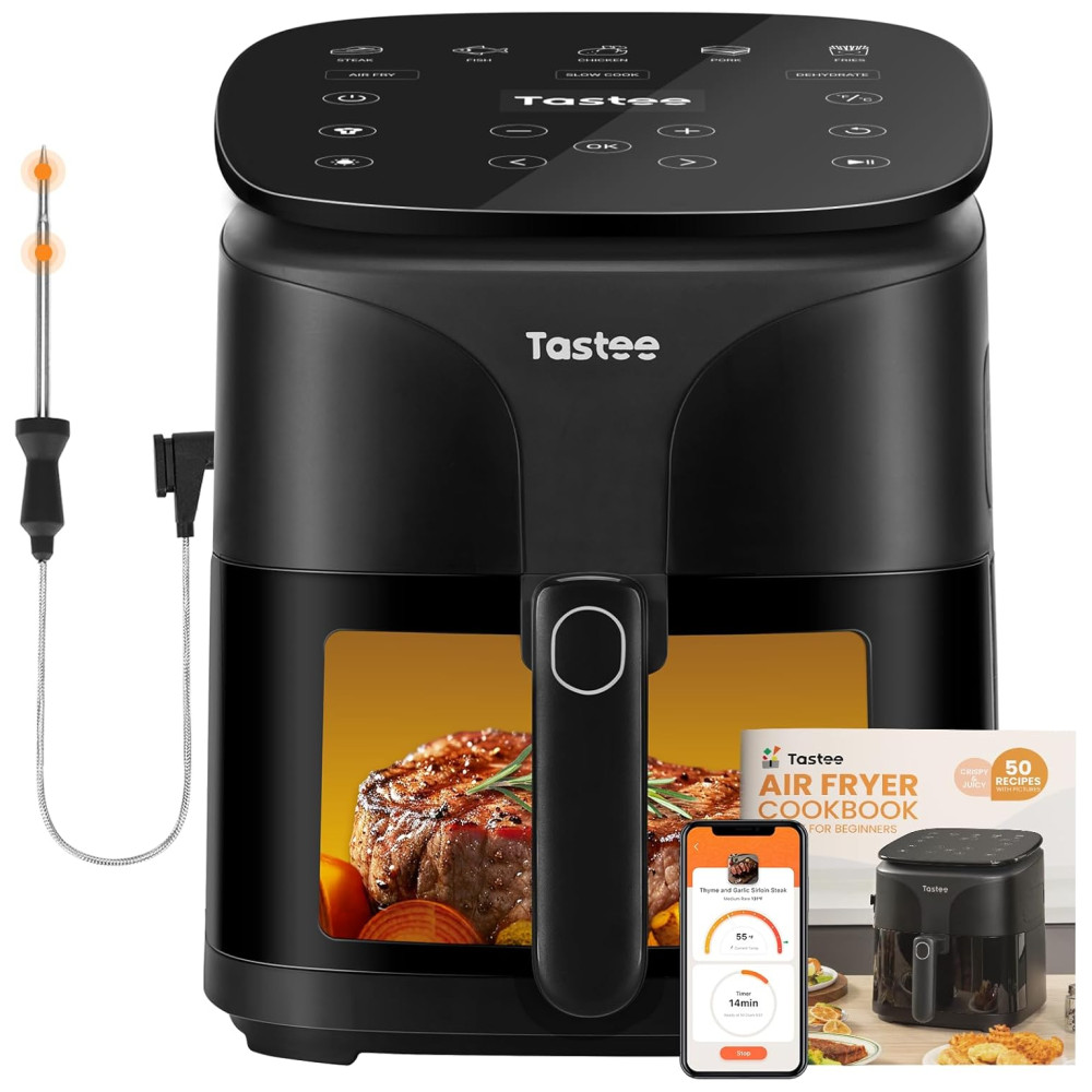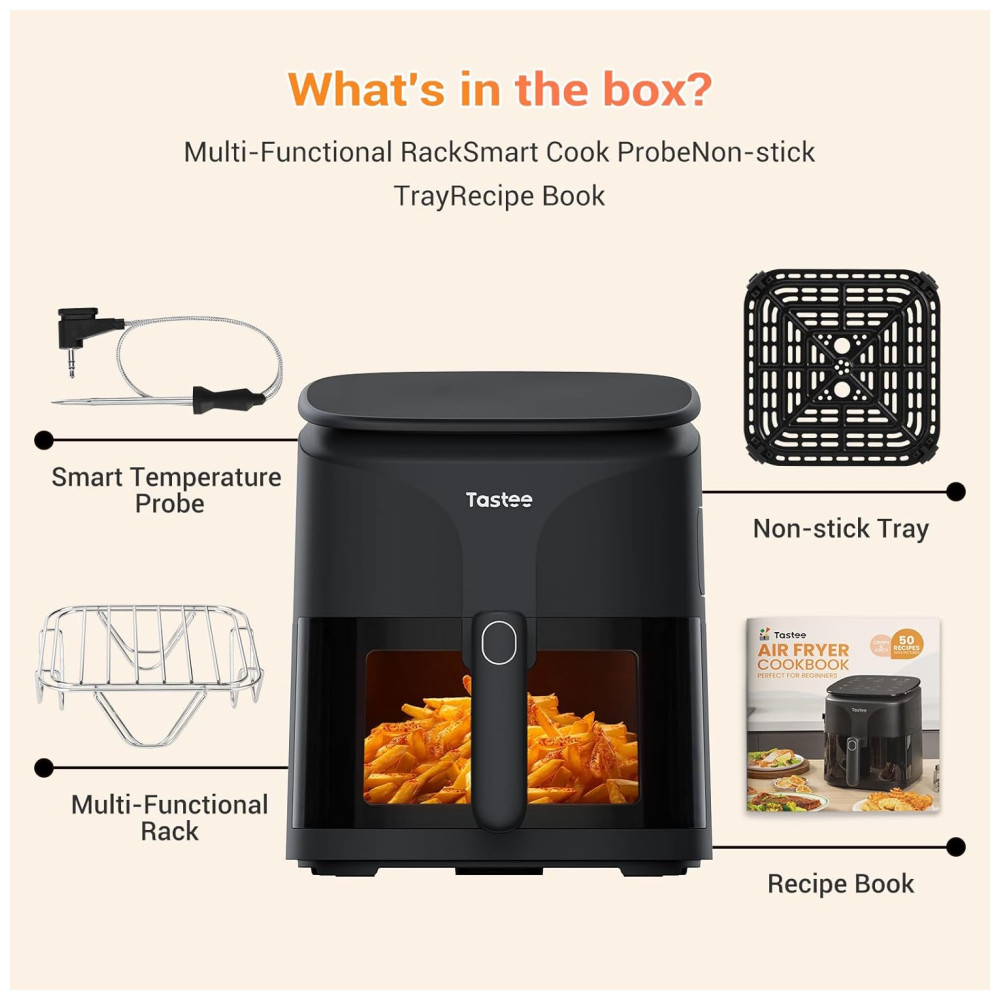 Air Fryer 8 em 1 5.1L com 24 Predefinições de Cozimento Janela de Visualização Sonda Inteligente de Sensor Duplo Cesto Antiaderente e Livro de Receitas 110V 1700W Tastee AG-42IC Preta