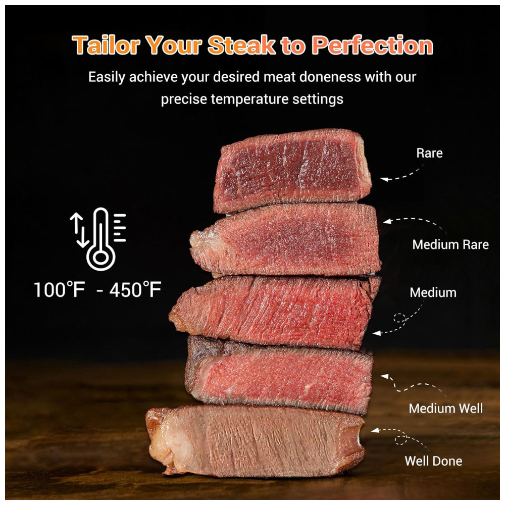 Nossa fritadeira de ar é projetada para oferecer um desempenho excepcional, com a capacidade de cozinhar alimentos a uma temperatura máxima de 450ºF (230ºC), 50ºF (10ºC) a mais do que muitas fritadeiras convencionais. Seu motor de alta velocidade de 2800 RPM acelera o aquecimento em 40%, permitindo que seus alimentos fiquem dourados e crocantes de forma uniforme em minutos.
