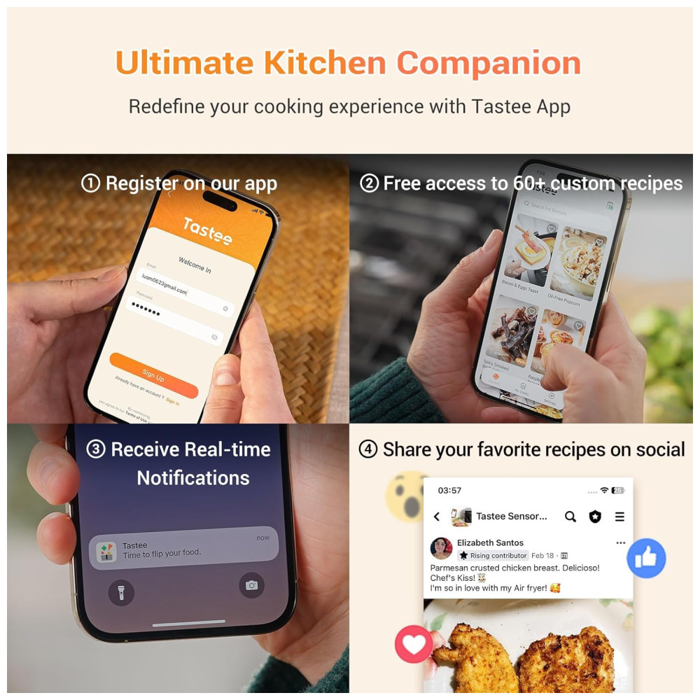 Além disso, nossa fritadeira digital inclui um aplicativo que oferece mais de 60 receitas, garantindo que você tenha sempre novas ideias de refeições à disposição. Desfrute da textura crocante da fritura tradicional com até 95% menos óleo, permitindo que você saboreie seus alimentos fritos favoritos sem culpa.