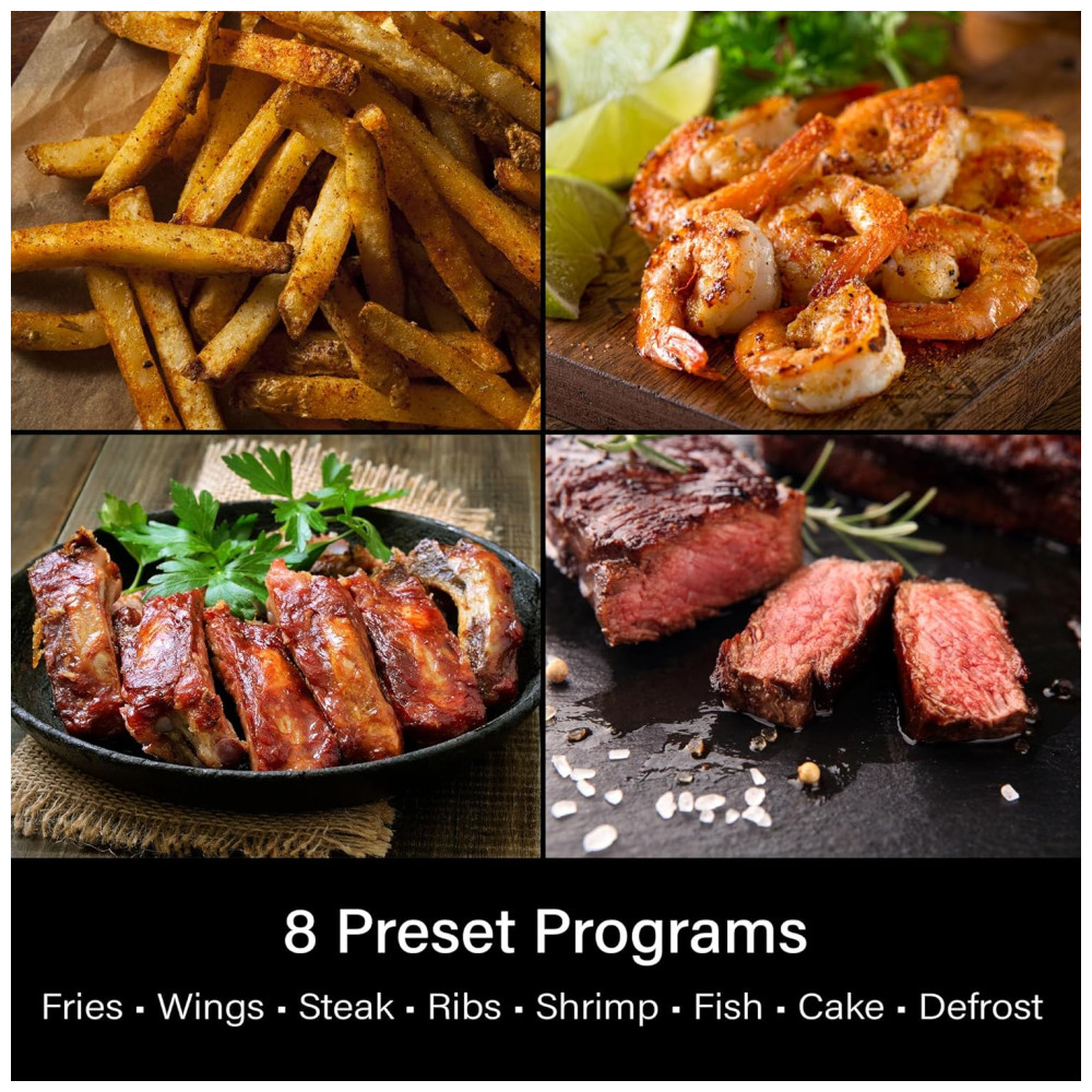 Esta fritadeira de ar possui uma capacidade generosa de 5,41 litros, ideal para preparar porções amplas para toda a família. Com oito programas de cozimento predefinidos, incluindo batatas fritas, costeletas, camarão, bolo, asas de frango, bifes, peixe e descongelamento, ela atende a diversas preferências culinárias.
