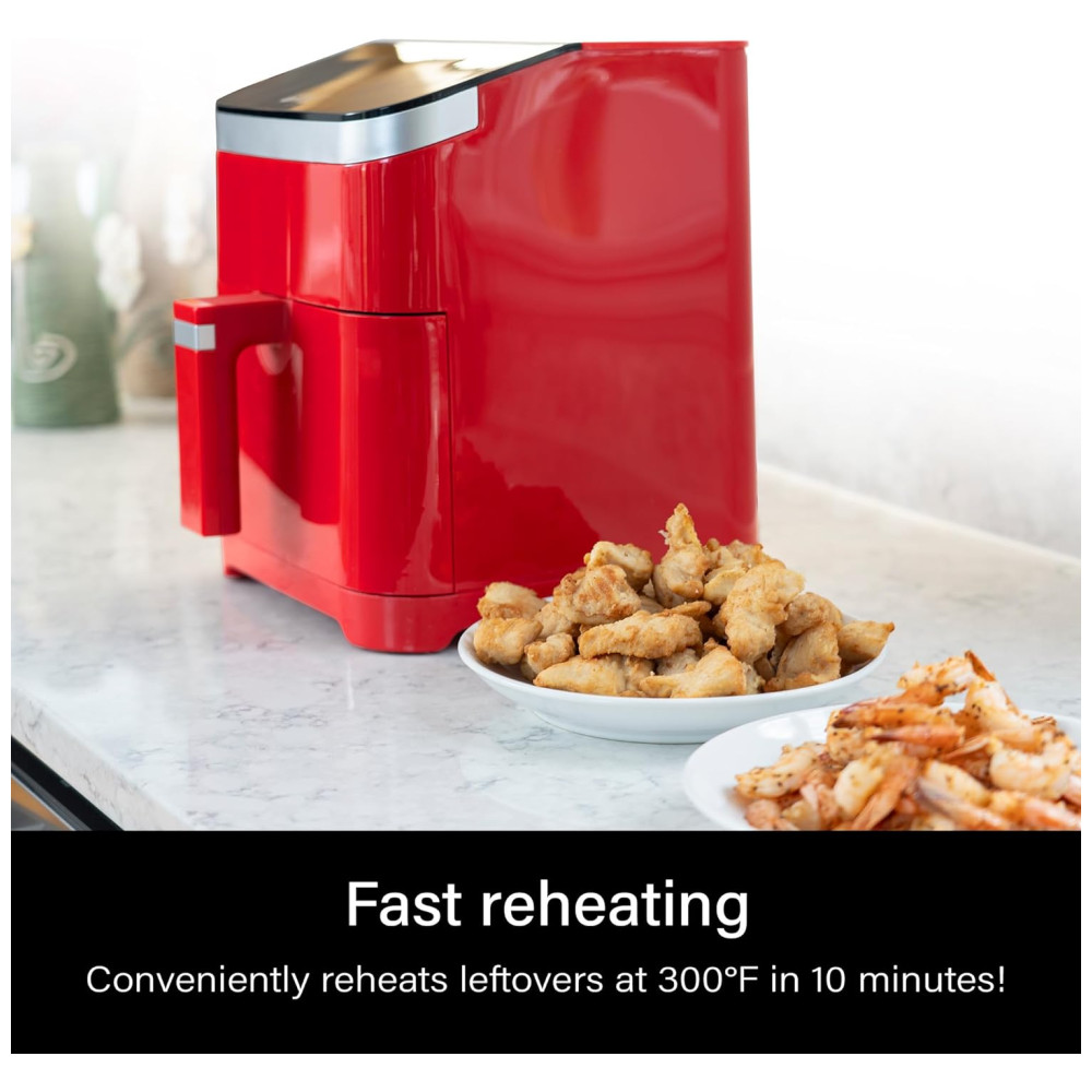O display digital elegante e o painel de controle intuitivo permitem ajustes precisos de temperatura, variando de 100ºF a 400ºF (38ºC a 200ºC), e um temporizador de 30 minutos com alarme, proporcionando facilidade e praticidade na cozinha. A fritadeira também se destaca no reaquecimento, permitindo que você aqueça ingredientes e refeições com eficiência. A configuração de temperatura de 300ºF (150ºC) por até 10 minutos garante um reaquecimento rápido e eficaz, sem comprometer o sabor ou a textura dos alimentos.