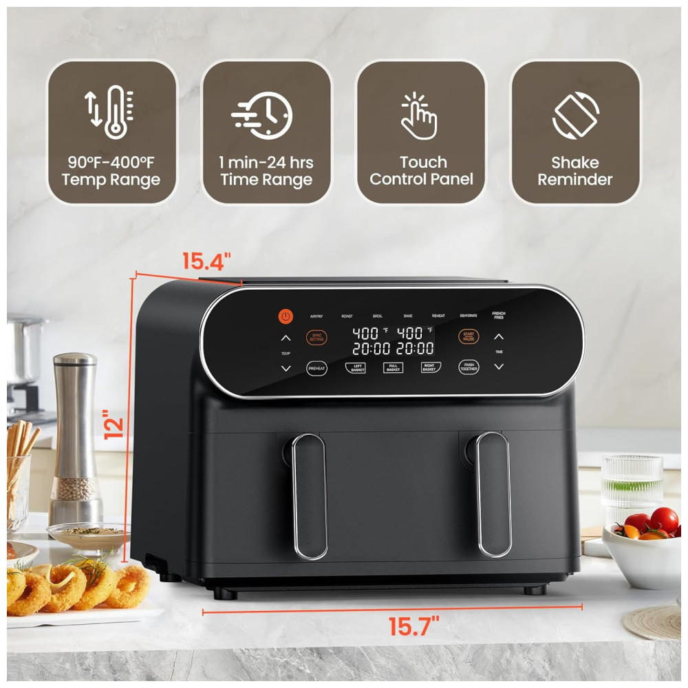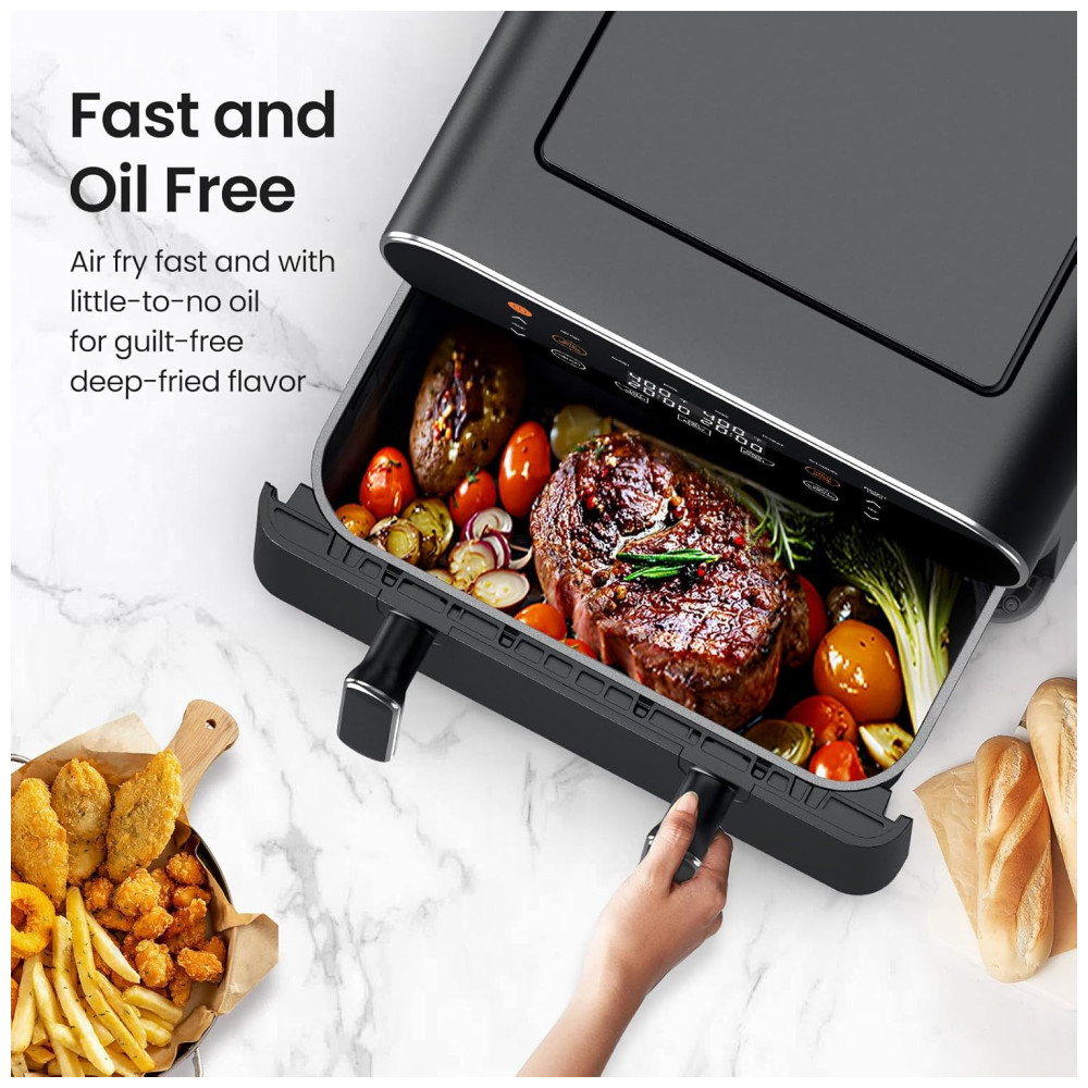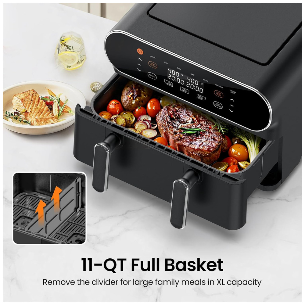 Pacote Completo: A fritadeira sem óleo vem equipada com uma cesta de 10,4 L, um divisor removível, uma placa mais crocante e 17 receitas fáceis de seguir para iniciar suas aventuras culinárias. Tudo o que você precisa para elevar a hora das refeições.
