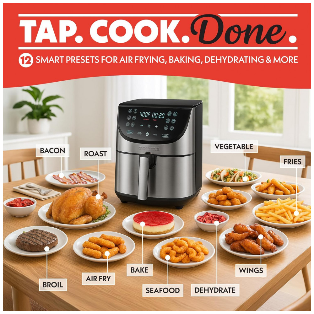 O Gadget de Cozinha Perfeito: Este forno multifuncional elétrico é ideal para preparar batatas fritas, asas de frango, peixe, bacon, frutos do mar, vegetais, assar, grelhar, desidratar, tostar, reaquecer e manter os alimentos aquecidos. Com 12 predefinições digitais de 1 toque, você obtém os melhores resultados em cada preparo.