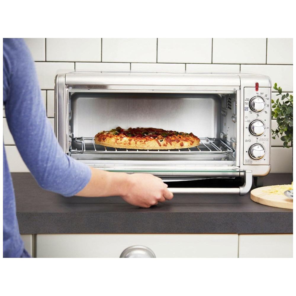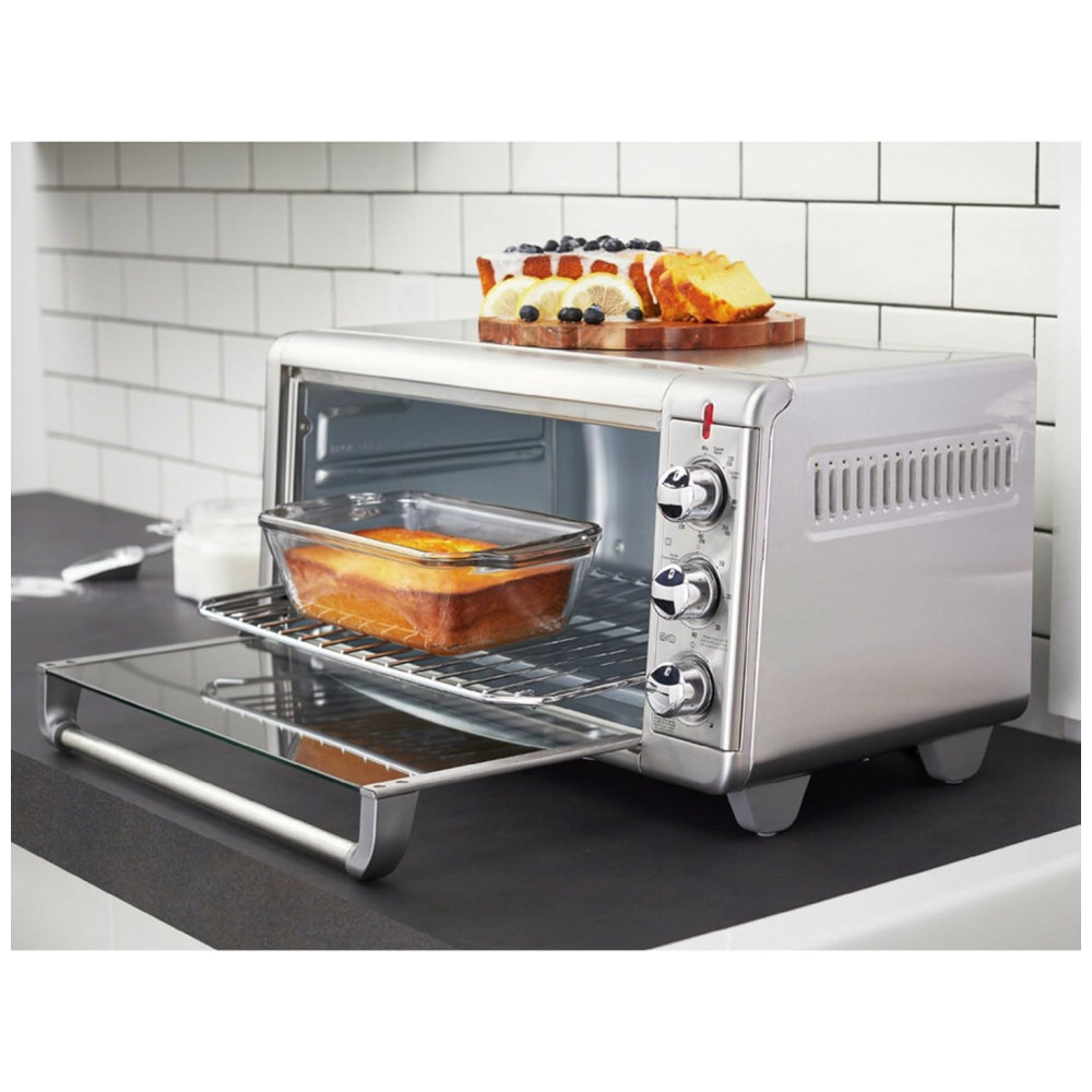 Capacidade Extra Grande: Ideal para toda a família! Este forno acomoda uma forma de 23 cm x 33 cm com alças, 8 fatias de pão ou uma pizza de 30 cm.