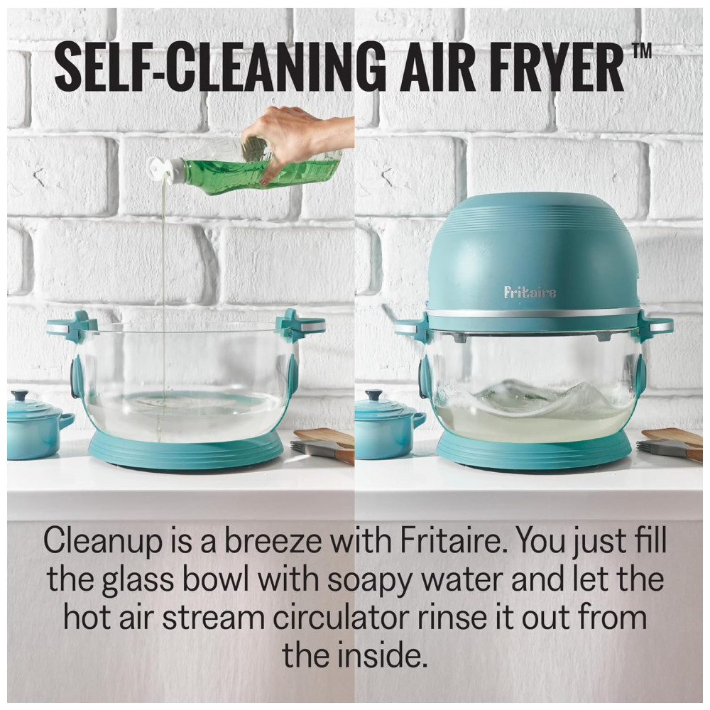 Aproveite a conveniência de monitorar o progresso dos seus alimentos sem interromper o processo de cozimento com a nossa fritadeira de ar de vidro. Equipada com um aquecedor de 1500 W e sistema de convecção de vórtice, garante refeições consistentemente crocantes e uniformemente cozidas todas as vezes. Ideal para quem busca uma fritadeira de ar de fácil limpeza, basta encher a tigela de vidro com água e sabão e deixar o modo de autolimpeza fazer o trabalho para você. A Fritaire oferece 6 modos de cozimento versáteis, desde bifes suculentos até batatas fritas crocantes, incluindo um espeto giratório feito de aço cromado seguro para alimentos, uma grelha de aço inoxidável e um cesto giratório para batatas fritas feito de aço inoxidável, todos laváveis na máquina de lavar louça. Funciona em tomadas padrão dos EUA 110 -115 V com motor de espeto giratório alimentado por quatro pilhas 4 AAA. Fique tranquilo sabendo que nossa tigela de vidro é livre de BPA, teflon e ftalatos, proporcionando uma alternativa de cozinha mais saudável, perfeita para pessoas preocupadas com a saúde que buscam uma fritadeira atóxica ou sem teflon.