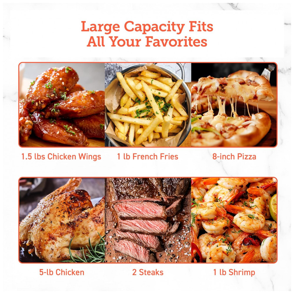 Grande Capacidade: Prepare comida suficiente para alimentar toda a família com o cesto de 5,5 litros que acomoda um frango inteiro ou refeições para até 3–5 pessoas.