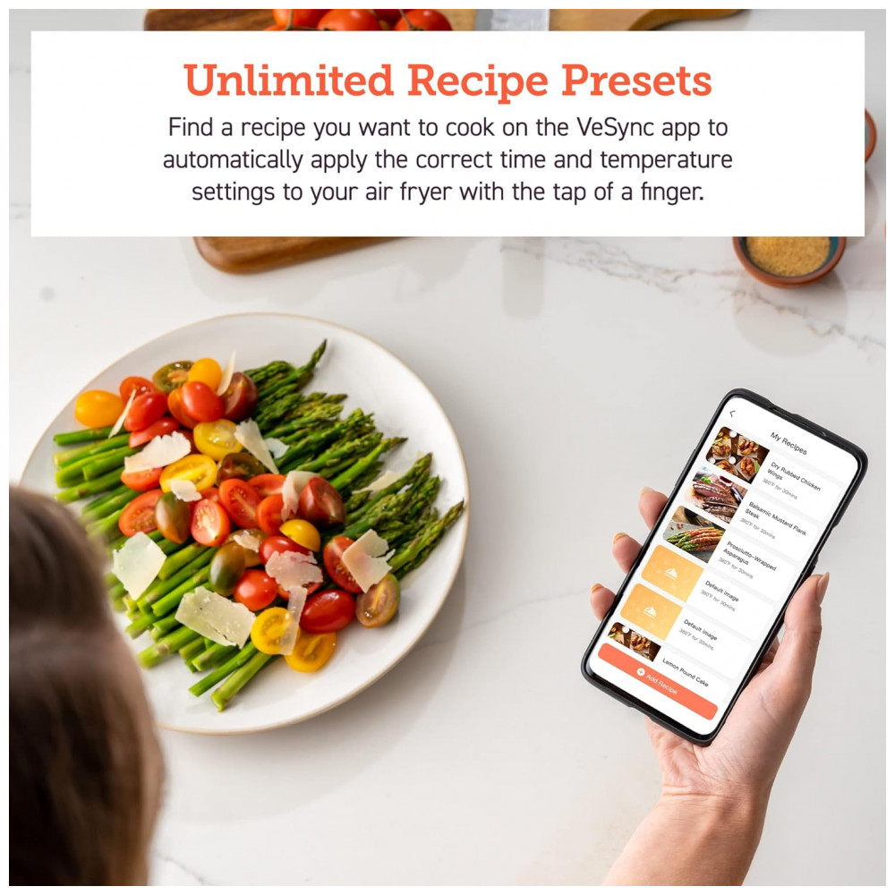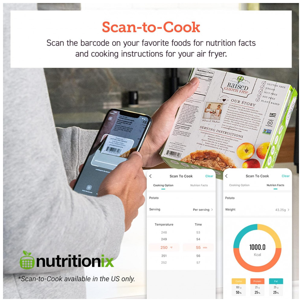 SCAN-TO-COOK: Com o aplicativo VeSync, você pode escanear diferentes tipos de alimentos para obter instruções de cozimento fáceis de seguir, ajustadas para sua air fryer, além de informações nutricionais.