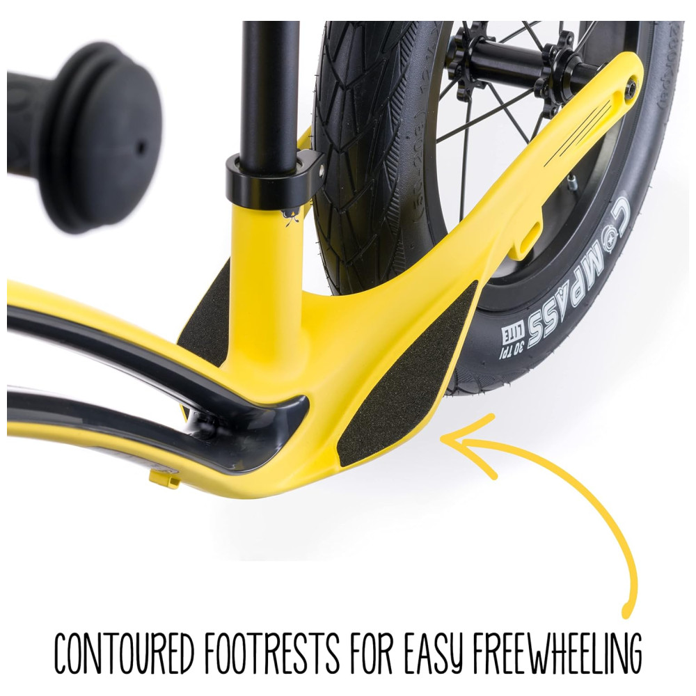 DESIGN LINDO os apoios para os pés com fita adesiva são contornados no quadro para facilitar a rotação livre, pneus de borracha preenchidos com ar para um passeio mais suave e uma haste acolchoada para proteção extra. Totalmente testado por segurança pela TVRheinland para crianças a partir de 18 meses EN71. CE aprovado.