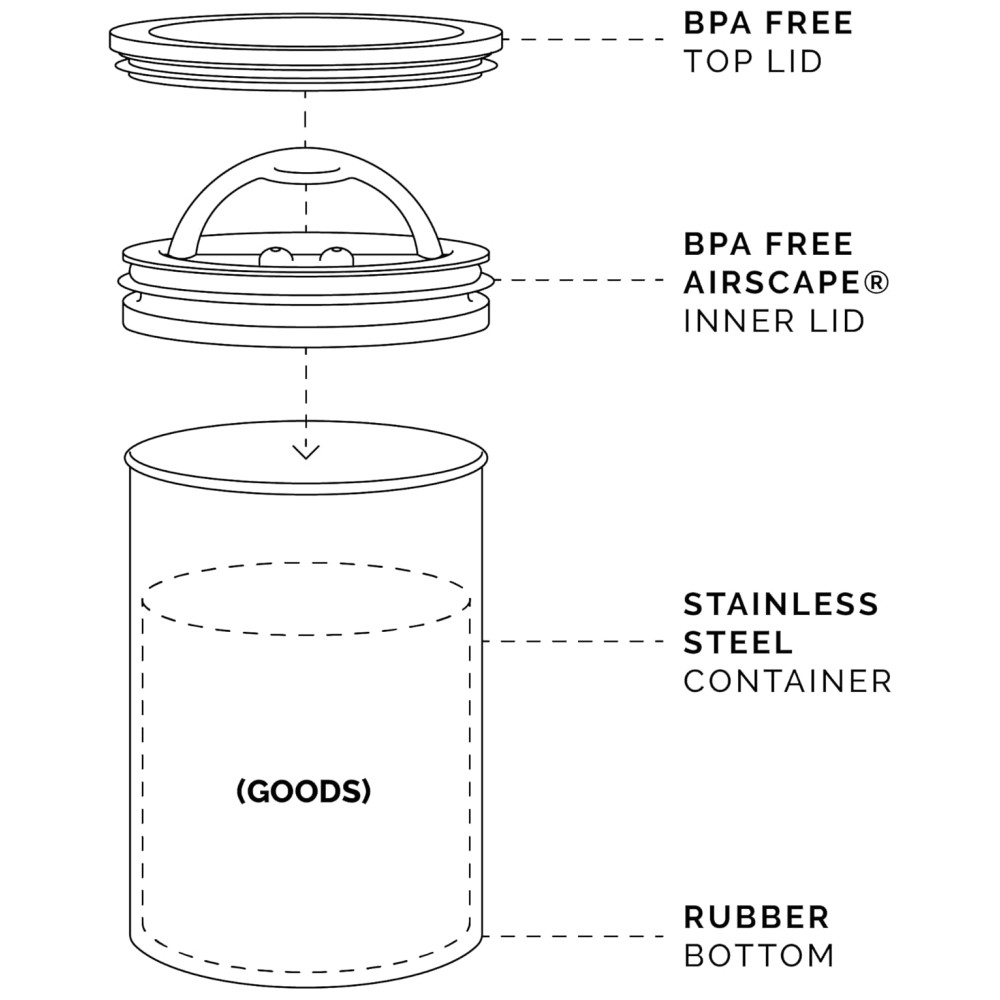 PROJETO INOVADOR E PATENTEADO Recipiente de zenamento de café e alimentos Airscape com tampa de êmbolo patenteada que remove e bloqueia o ar e a umidade. Válvula bidirecional patenteada que empurra o excesso de ar para preservar e proteger o frescor e o sabor.
