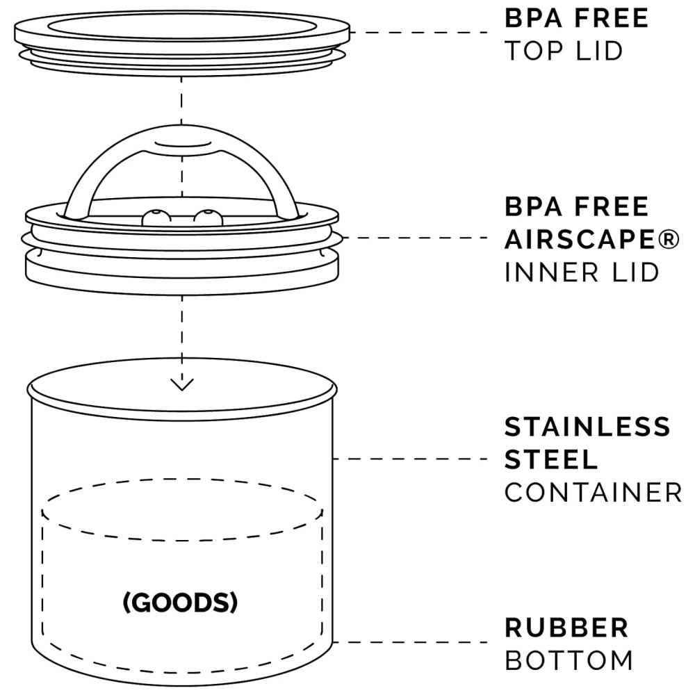 SOM DE FRESCO A tampa Airscape remove todo o ar do recipiente, criando um zenamento de alimentos sem ar prolonga a vida útil do café, chá, farinha, açúcar, cereais, biscoitos, sementes, ervas, nozes, rações para animais de estimação ou quaisquer bens perecíveis. O som swoosh permite que você saiba que está funcionando