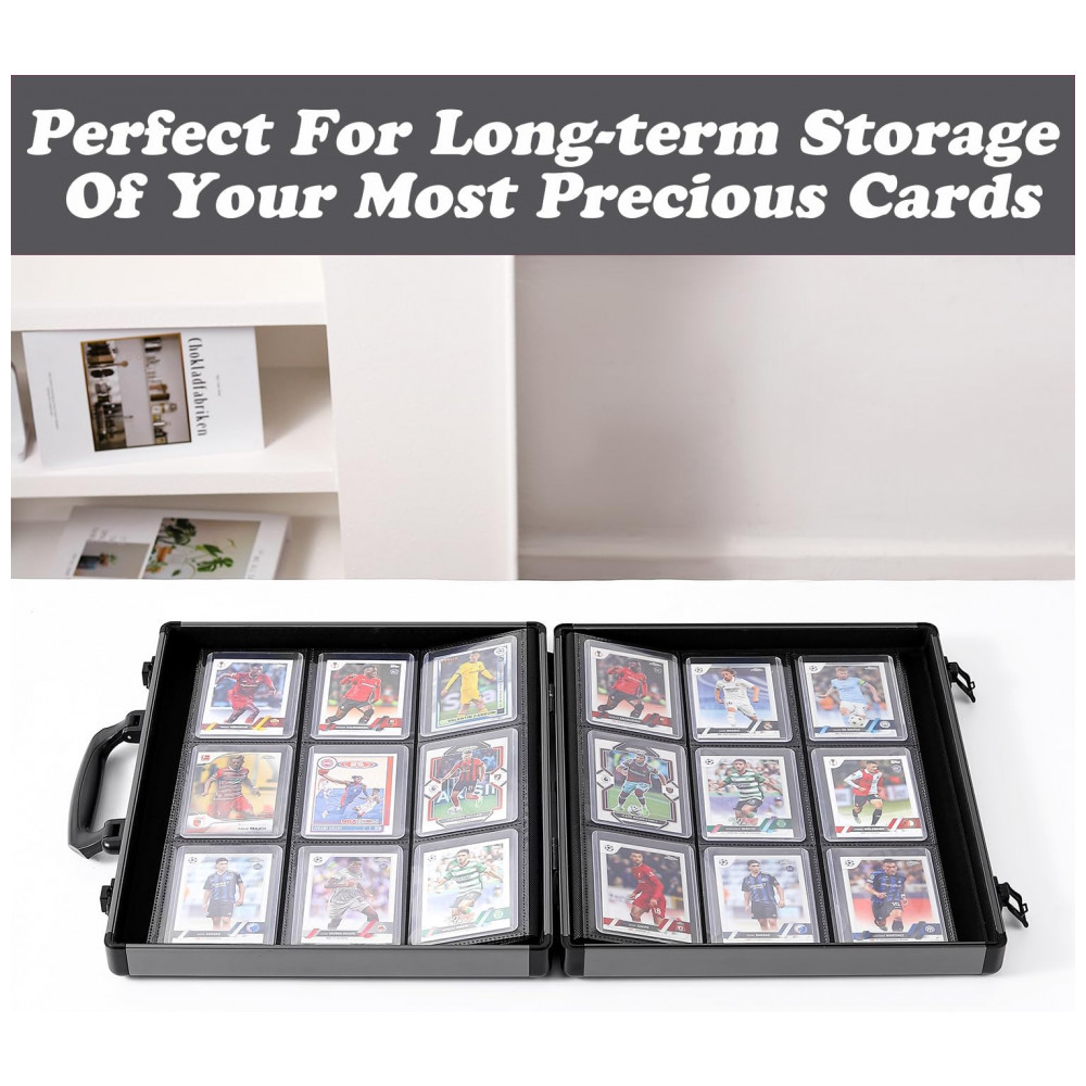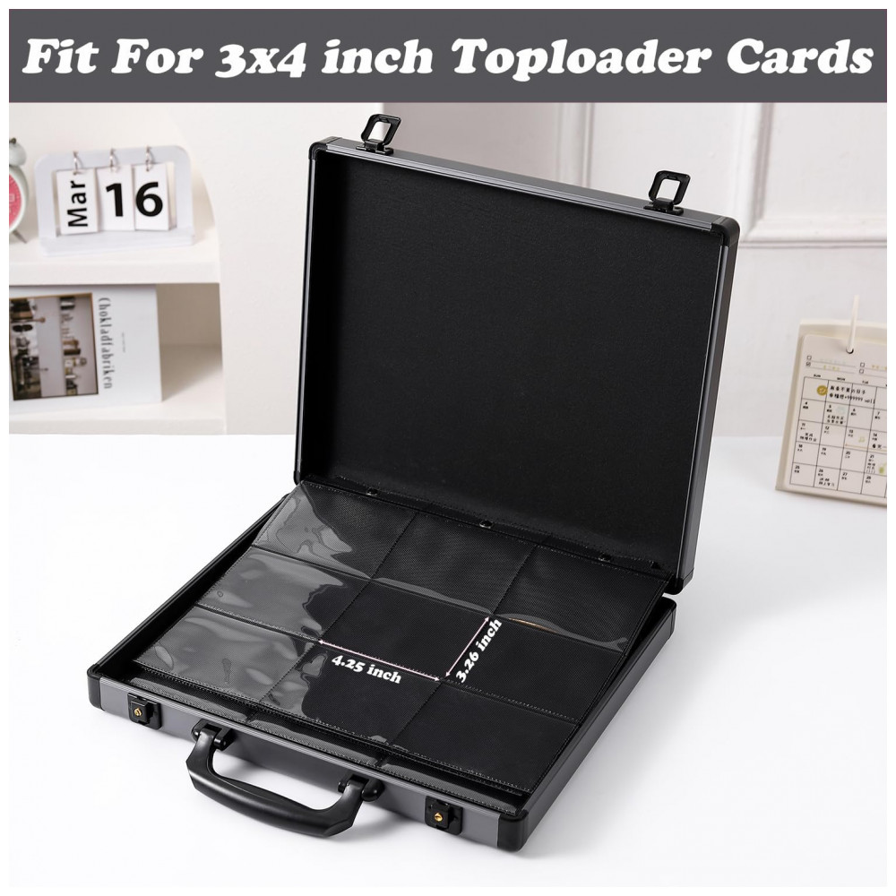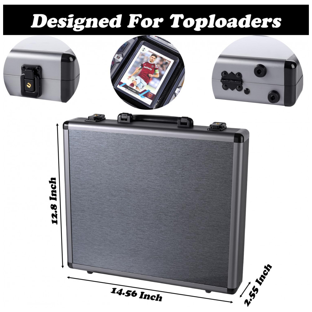 O fichário rígido Azamou Toploader Binder é uma maleta para armazenamento de cartas em toploader, com estrutura em liga de alumínio e plástico e acabamento em cor cinza. O interior conta com 12 páginas com 9 bolsos cada, totalizando 108 bolsos dimensionados para acomodar até 216 toploaders de aproximadamente 7,6 cm x 10,2 cm.