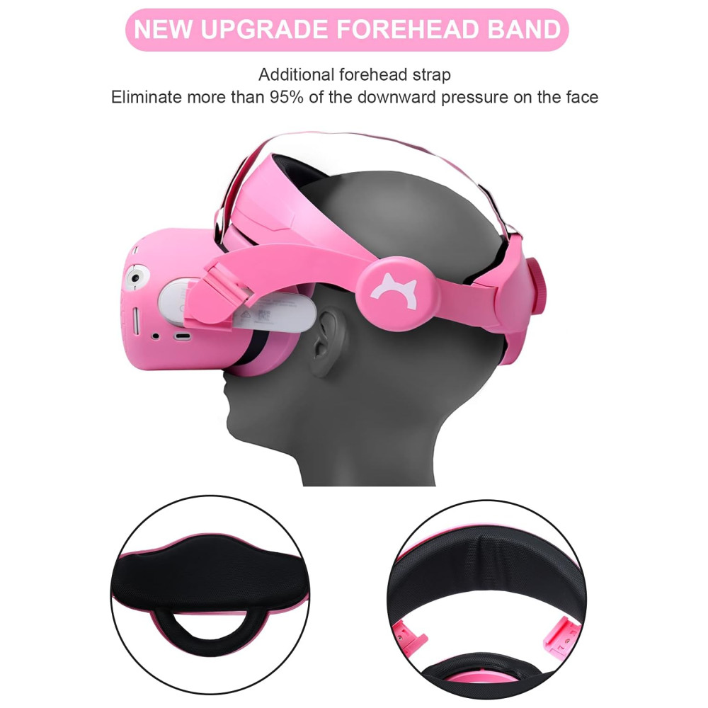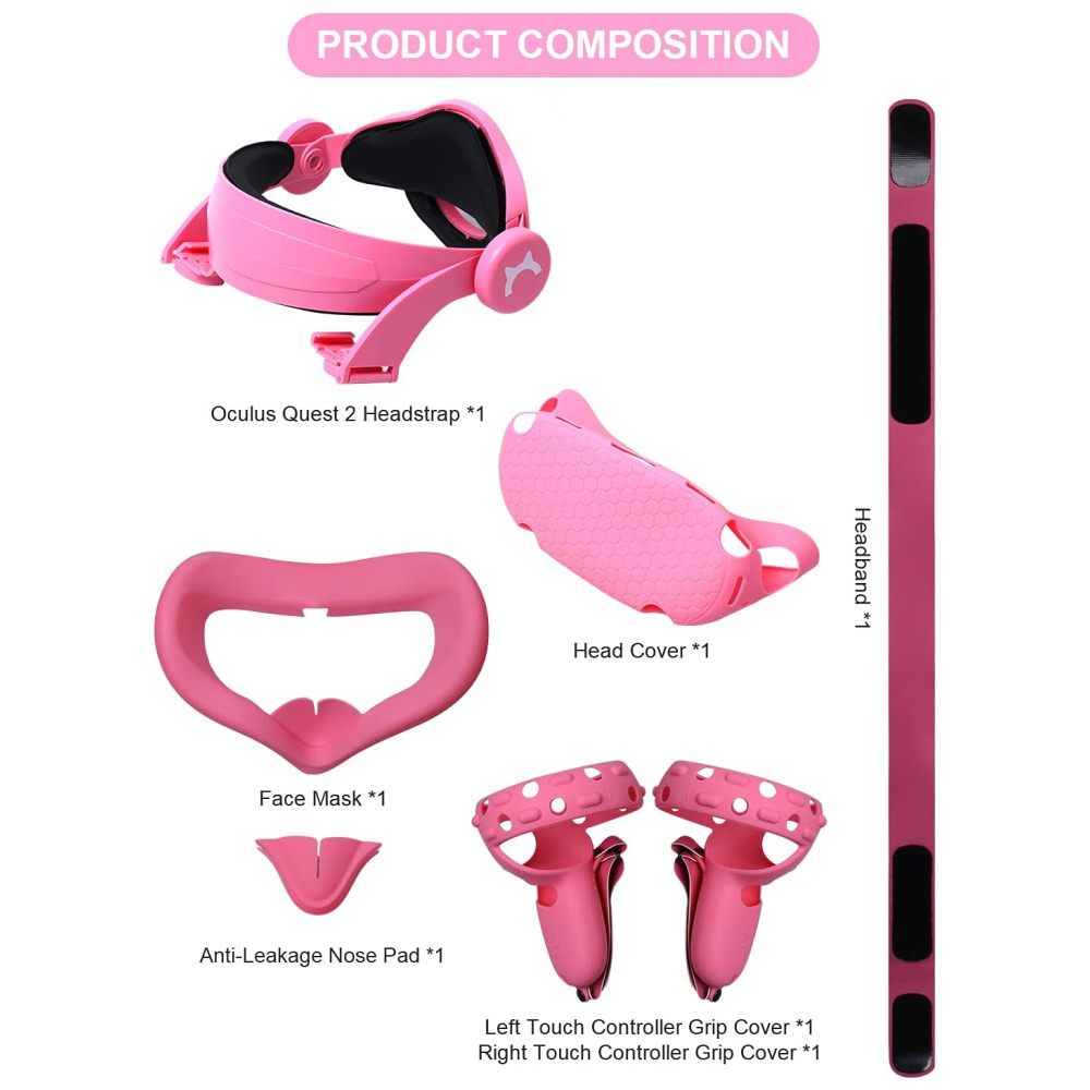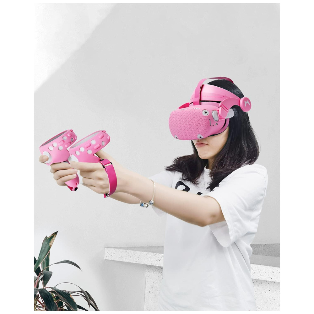 Alça de cabeça para Oculus Quest 2 com capa de silicone para controle de toque capa protetora de concha VR e capa facial VR 6 em 1 conjunto de reposição MODJUEGO Rosa