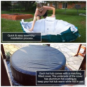 O volume total de água é de 1003 litros, sendo recomendado para uso residencial em ambientes externos ou internos. A banheira conta com funcionamento automático de inflação, painel digital, piso almofadado para maior conforto, filtro de cartucho e fácil instalação sem necessidade de ferramentas, demandando apenas uma tomada dedicada de 120V. A estrutura portátil permite inflar, desinflar e transportar o produto com praticidade, além de facilitar o armazenamento durante períodos de não utilização. Product design circular, cor preto e branco e dimensões externas de 208 cm de diâmetro x 66 cm de altura. Ideal para até 6 usuários simultâneos.