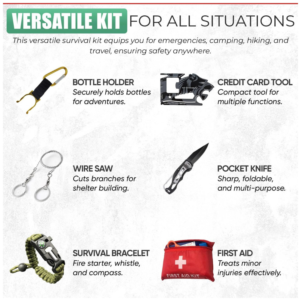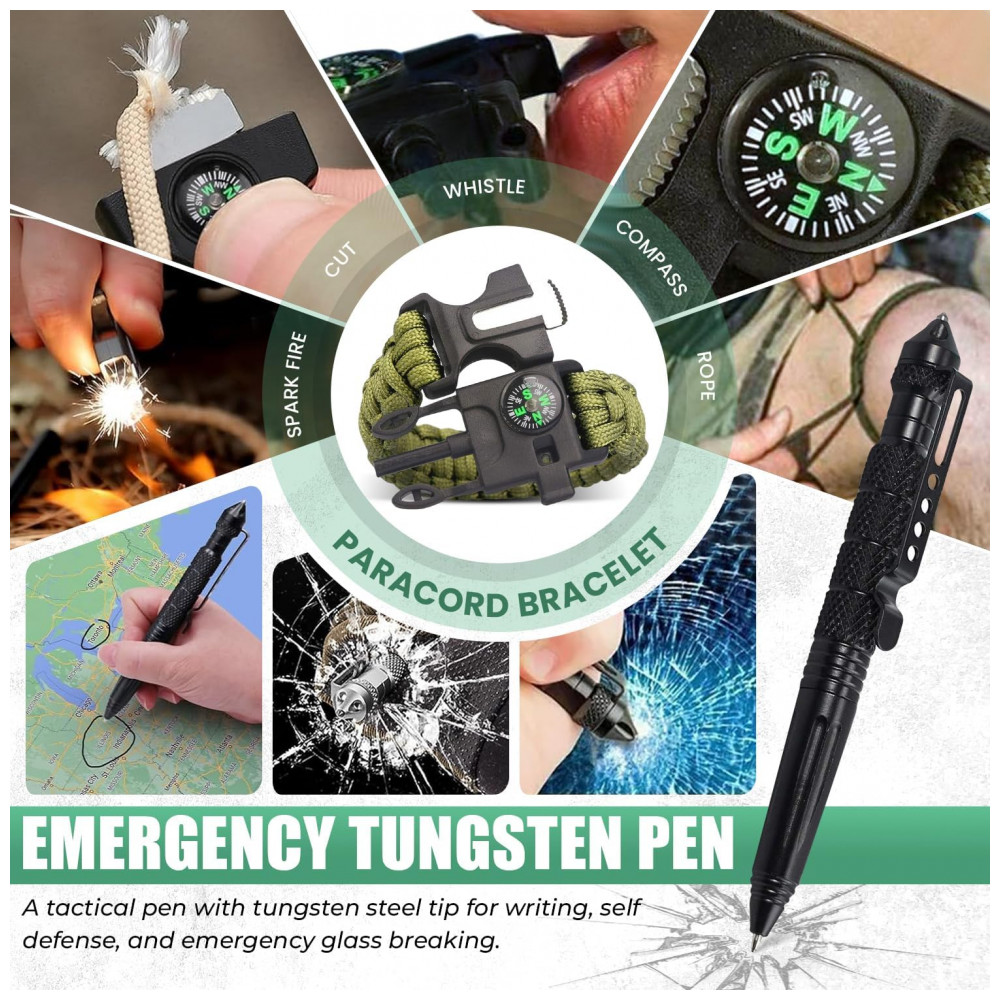 O conteúdo inclui caixa resistente à prova de tempestade, bússola precisa, serra de arame, pulseira universal Paracord com apito, bússola, pederneira de fogo, pedra de fogo, cobertor de emergência para 1 pessoa, caneta tática de aço, lanterna pessoal, faca dobrável, Ferramenta de cartão de crédito multiuso, bolsa Molle com suportes ajustáveis para celular