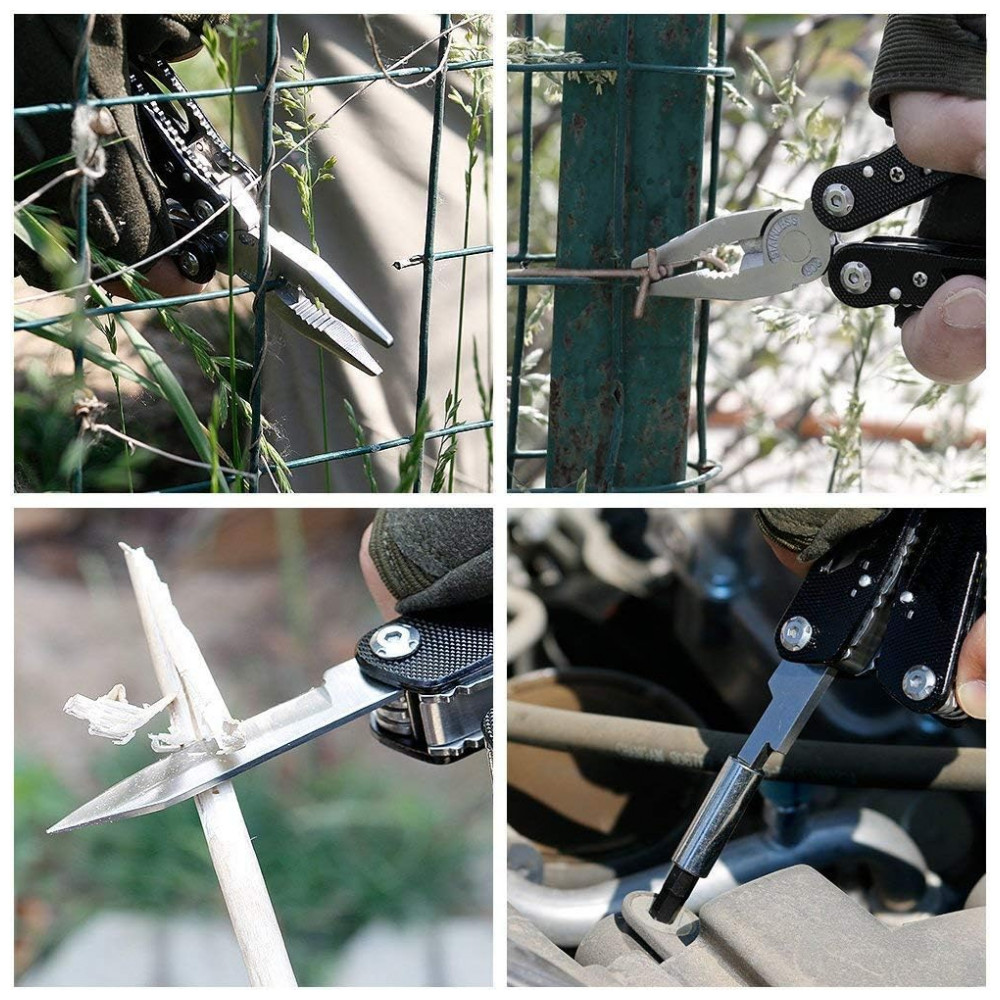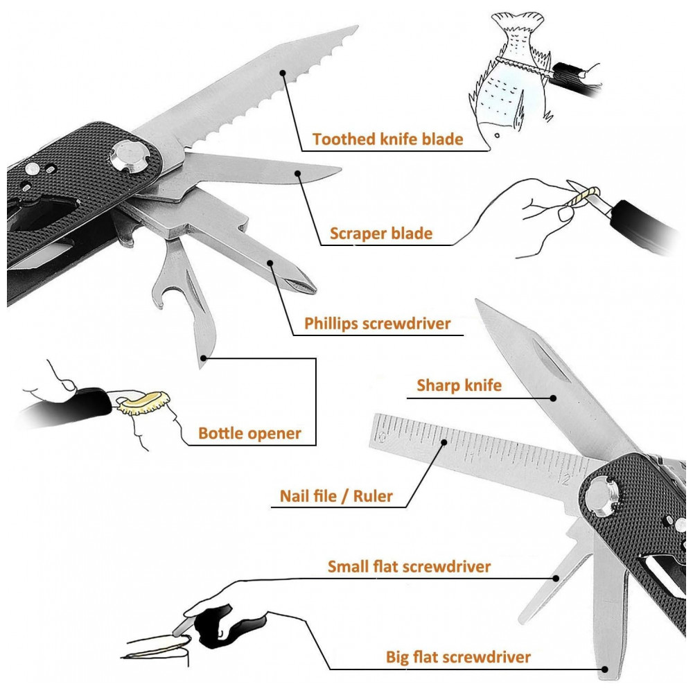 MÚLTIPLAS FERRAMENTAS 14 EM 1 Alicate, faca, cortadores de fio, serra de madeira, descascador de fios, abridor de latas, abridor de garrafas, chave de fenda grande, chave de fenda média, chave de fenda pequena, chave de fenda Phillips, lima de metal, furador de couro, anzol Removedor, Mecanismo de Bloqueio