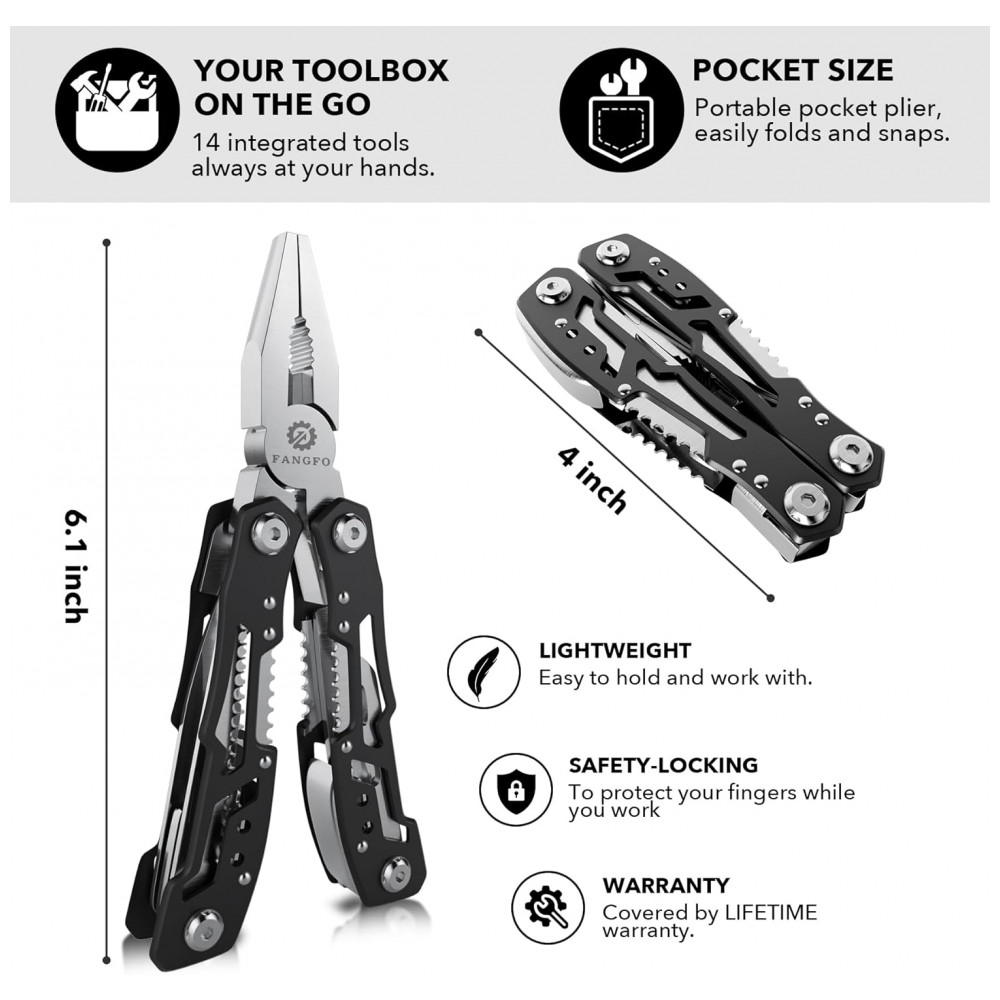 Alicate Multifuncional 14 em 1 Aço Inoxidável com Estojo de Nylon Fangfo Preto