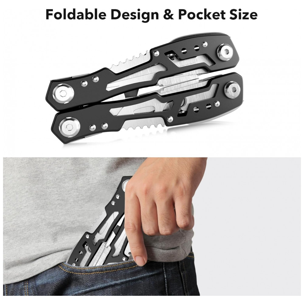 Leve e portátil com tamanho compacto e design dobrável, a ferramenta utilitária dobrável é fácil de guardar ou guardar no bolso. Esta multiferramenta de bolso vem com uma bolsa de nylon que permite ser amarrada no passador do cinto e não ocupa espaço