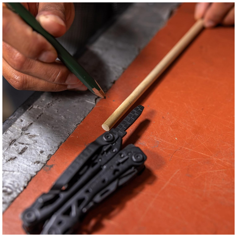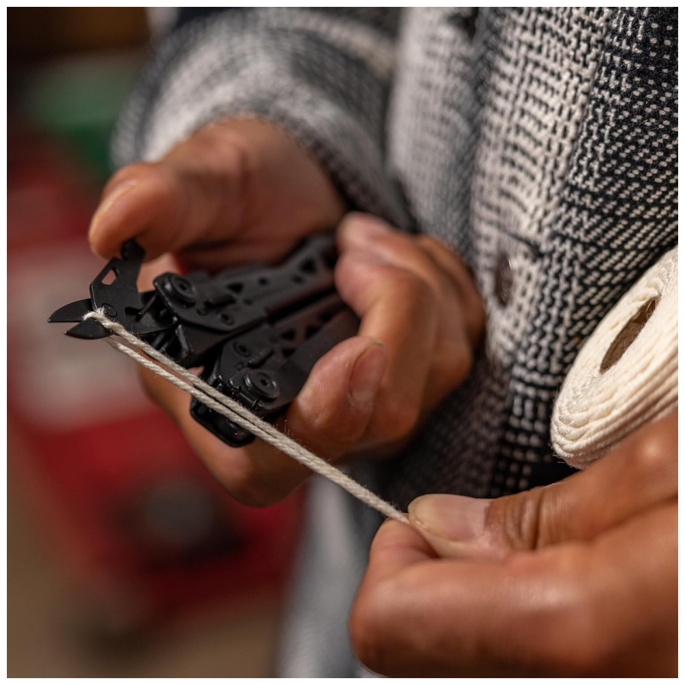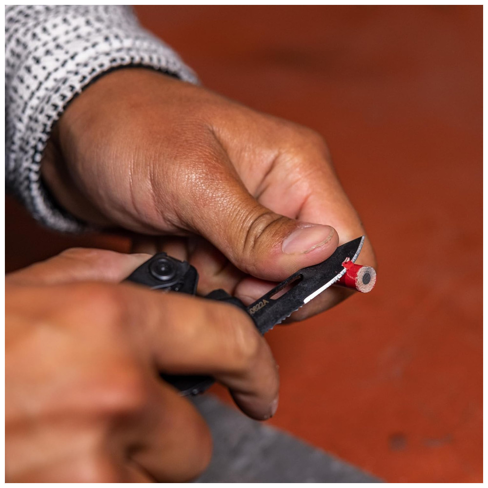 Multi ferramenta 15 em 1 Possui alicate de mola, decapador de fios, driver de cabeça chata média, furador, lima e régua.