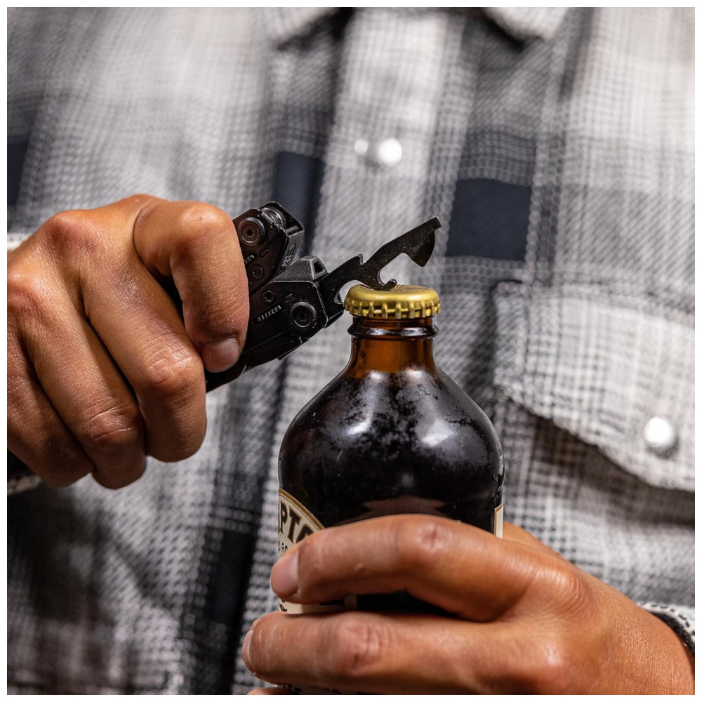 Canivete soldado de aço inoxidável inclui chave cruzada n 2, chave chata pequena, abridor de latas, abridor de garrafas, chave chata grande, descascador de fios, lâmina parcialmente serrilhada, trava de ferramenta, ponta de cordão e clipe de bolso.