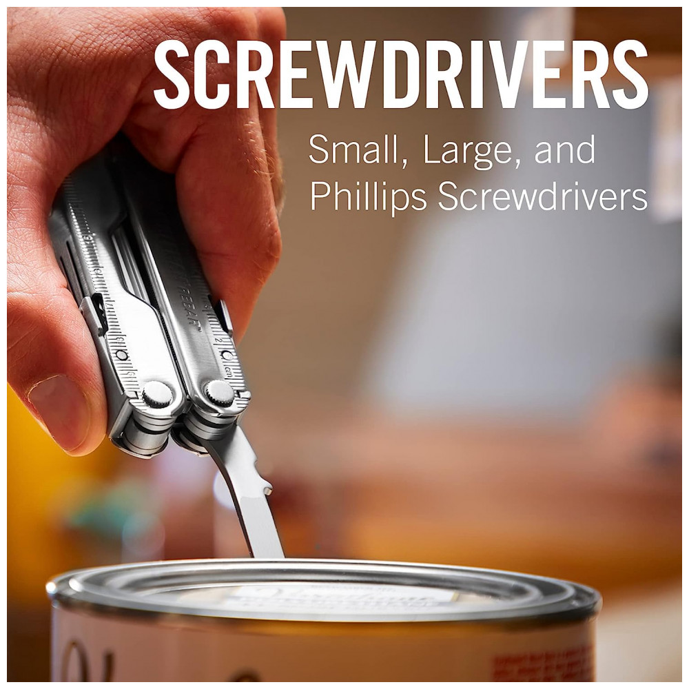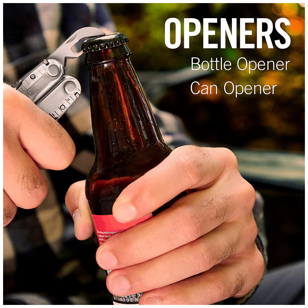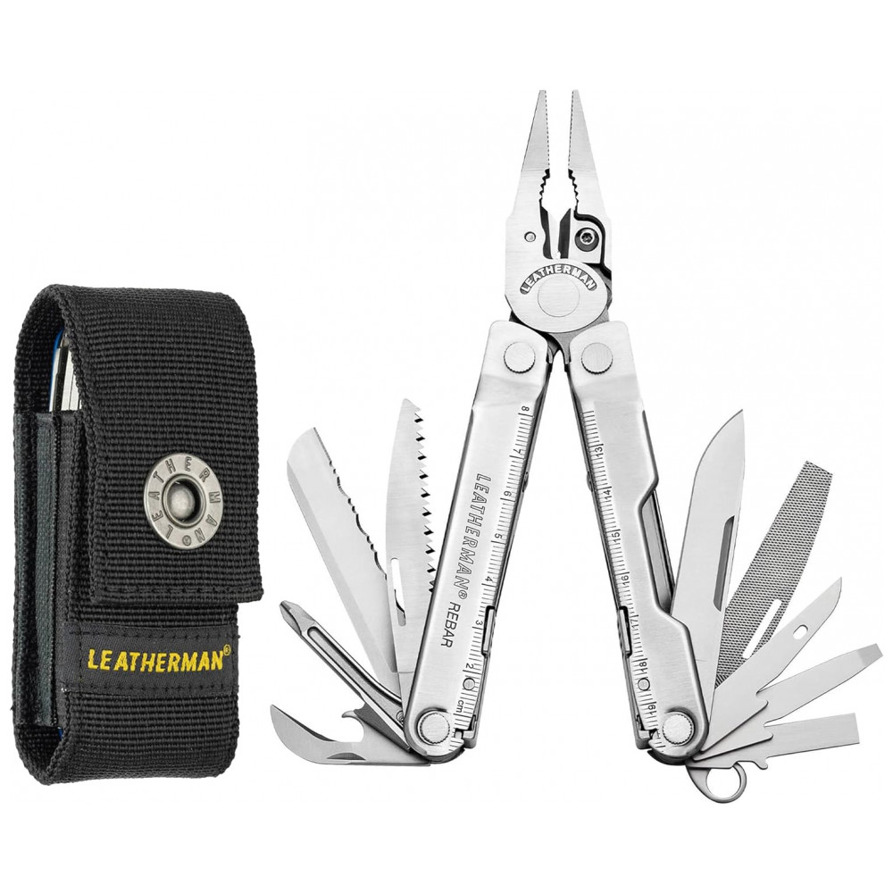 17 ferramentas em 1 A abundância de ferramentas do Rebar inclui facas, alicates, chaves de fenda, cortadores de fio, um alicate elétrico, um descascador de fios, abridores de latas e garrafas, uma lima, uma serra, um furador e uma régua.